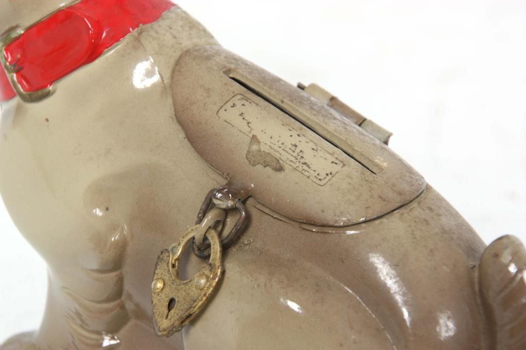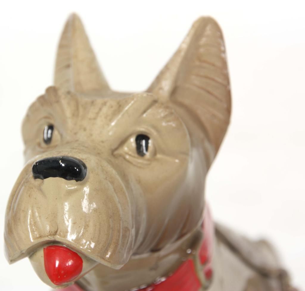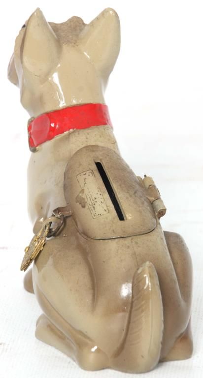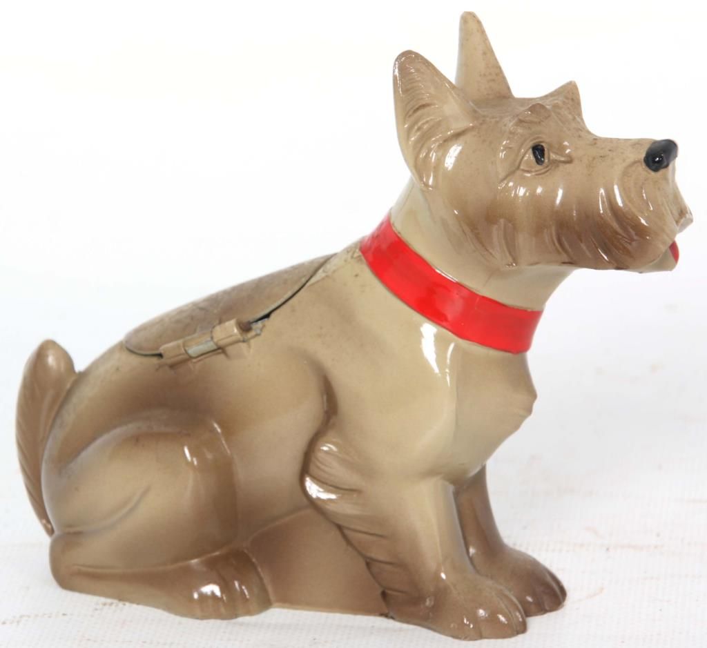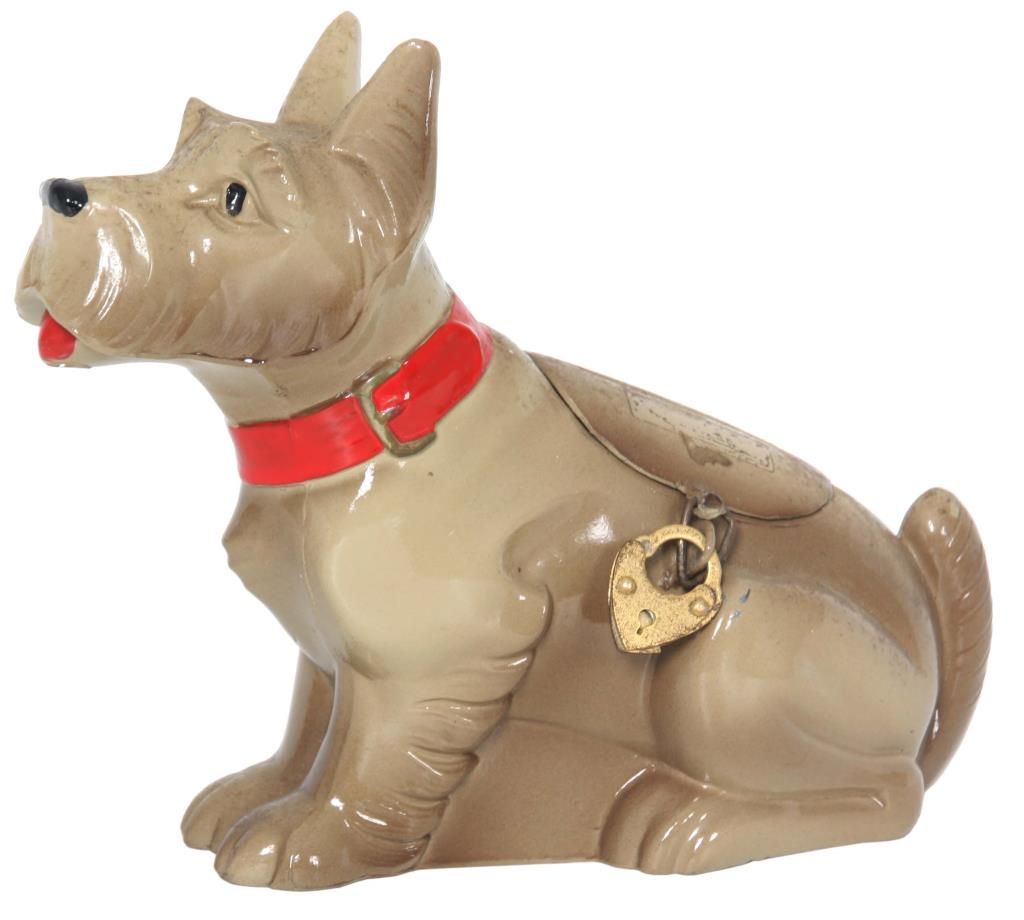 Spelter Scottie Dog Still Bank. Mint and never used cold painted spelter bank resembles a brown Scottie dog with a red collar; has a hinged door on its back with coin slot. Circa 1935. 4.5 in. high x 2.25 in. wide x 5.5 in. long.