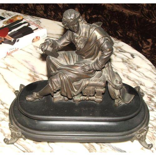 unsigned . Possibly French. Late 19th-early 20th century. French School depicting a seated male classical figure mounted on a footed pedestal base. 11" high by 12" long