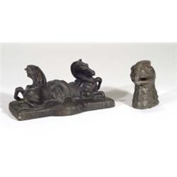 Spelter desk stand modelled as horses and a cast metal eagles head, largest 20cm long