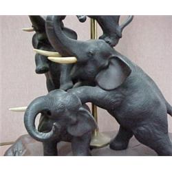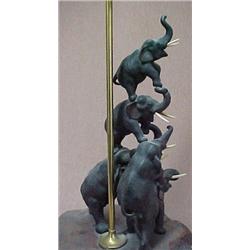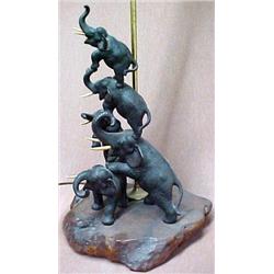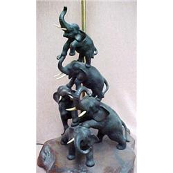 Spelter elephant lamp, five standing elephants in pyramid, ivory tusks, bottom elephant missing one tusk, on wood slab base, measures 15" high, early to mid 20th C. Estimate 100/200