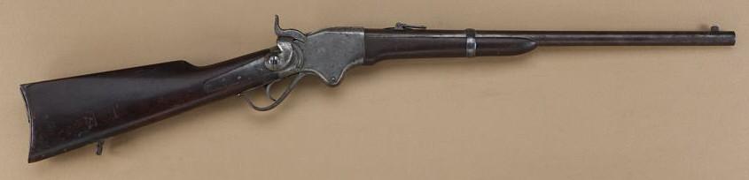 Spencer .56 rimfire caliber repeating carbine with Civil War issue original 22” barrel. Traces of blue and case-hardened finish. Serial #40152. Barrel shows strong traces of blue mixed with a brown patina, good edges,with light to moderate pitting and erosion. The frame show light traces of case hardening going to silvery grey with legible address on breech. The stocks are good with dings, mars, scratches, and minor imperfections, and no cartouche visible. The action is good. There is some faint case hardening on interior. The action is good, the bore is very good. Far above average for a Civil War Spencer with original length barrel.Soldier’s initials “JM” carved into stock on right side. Est: $1,500 - $3,000