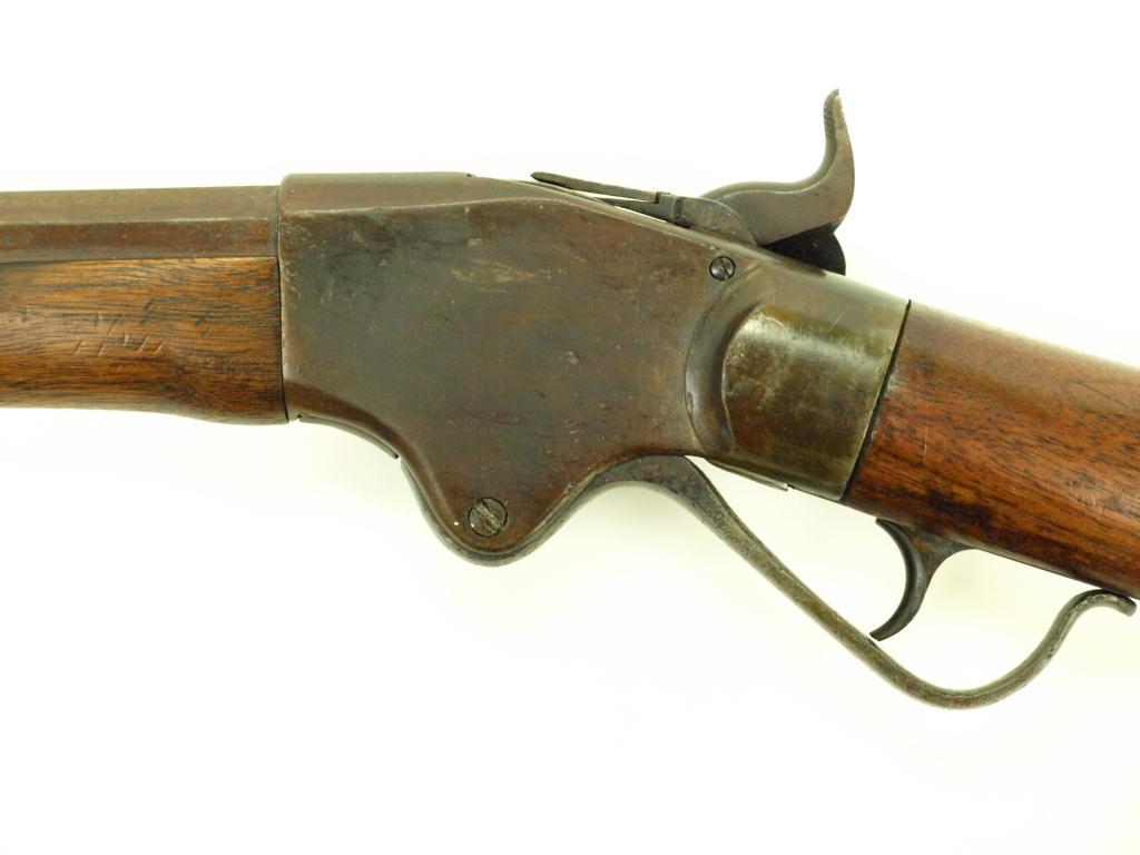30" octagon barrel, walnut stocks and steel butt plate, top of receiver marked Spencer Repeating/Rifle Co. Boston, Mass./ Pat'd March 6, 1860. Rifle has been re barreled and marked H. Bigelow Marysville CA. Show descent overall condition, all steel surfaces show deep brown patina, walnut stocks show good overall condition, no cracks or repairs. Good functioning action with surprisingly good shiny bore. Manufactured 1867, NO FFL required. Interesting old Spencer from a Wyoming collection.