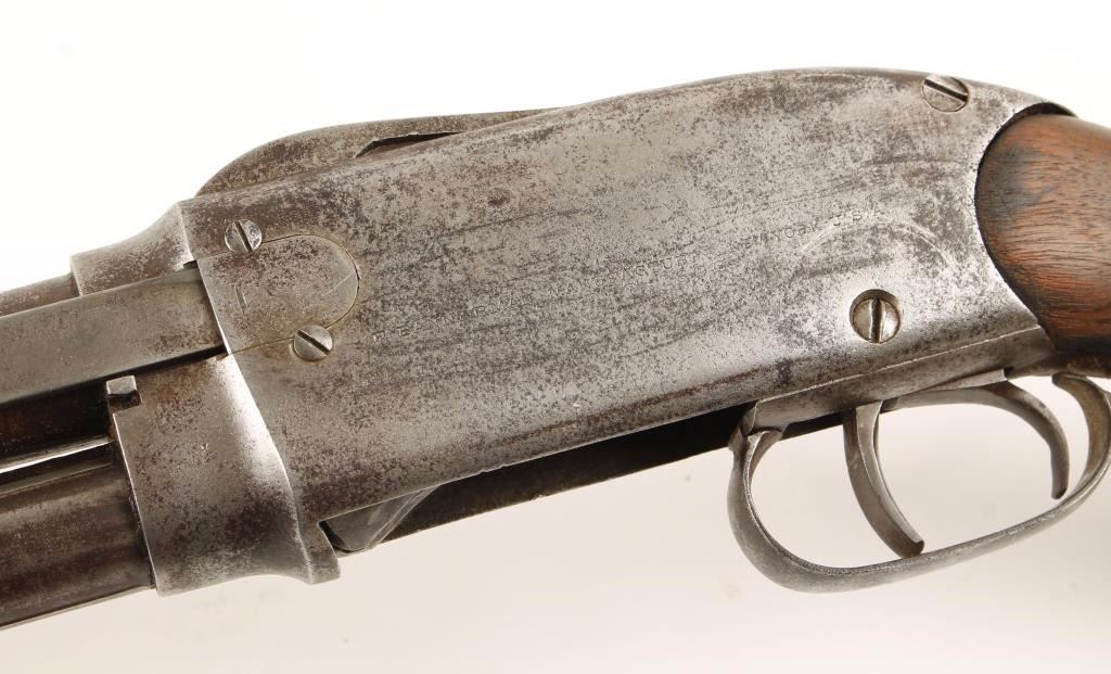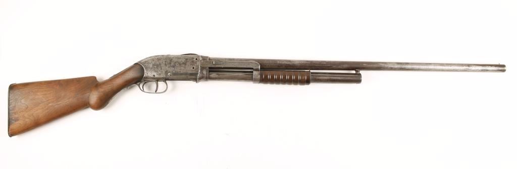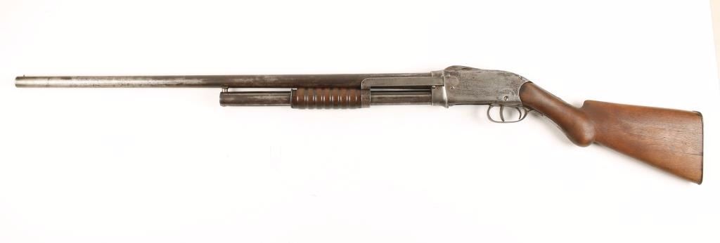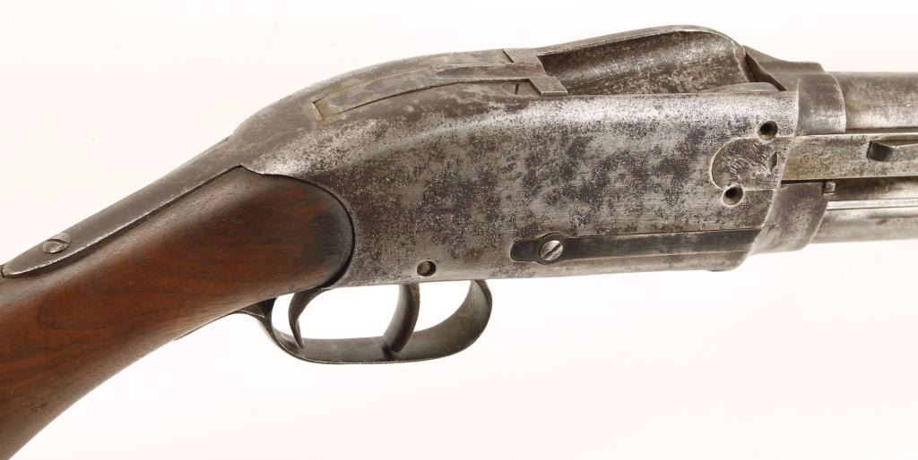 Slide action tube fed repeating shotgun chambered for 12 gauge shells, circa 1900's. Manufactured by F. Bannerman of New York off Spencer's patent. Features a 30.25" damascus barrel, brass bead sight, set triggers, 1/2 magazine tube, steel receiver, grooved wood pump handle and pistol grip shoulder stock with checkered metal buttplate. Barrel shows good damascus pattern mixed with dark patina and receiver is mostly bare metal with dark pitting. Action is smooth, bore is dirty but remains some brightness and wood stocks has some damage but are good overall. Condition is good as near antique. ***C&R Firearm*** ***Modern Firearm***