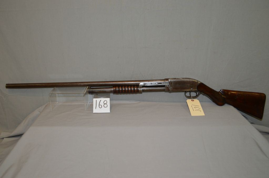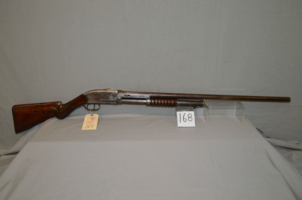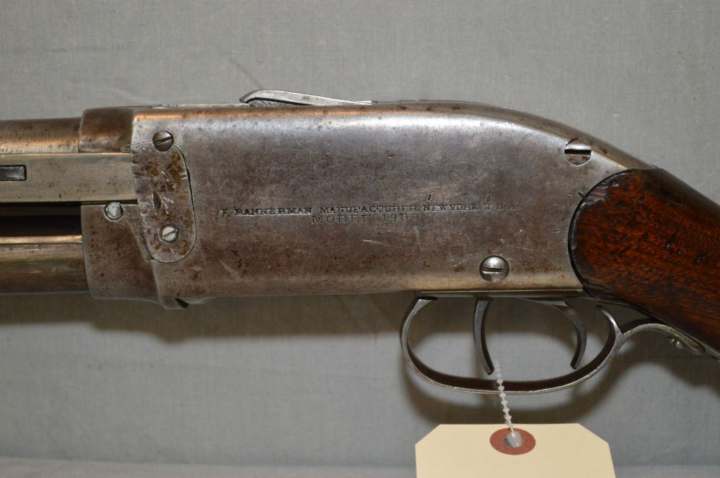 Spencer ( Bannerman ) Model 1900 .12 Ga Pump Shotgun w/ 30" bbl [ fading blue finish turning brown, these shotguns have an extractor mounted on the action bar, what appears to be two triggers within the trigger guard, the front trigger is actually an action release and the breech block that also performs as a shell lifter, appears to function but please have it checked by gunsmith before use, ( 119 ) ] Ser # 20230