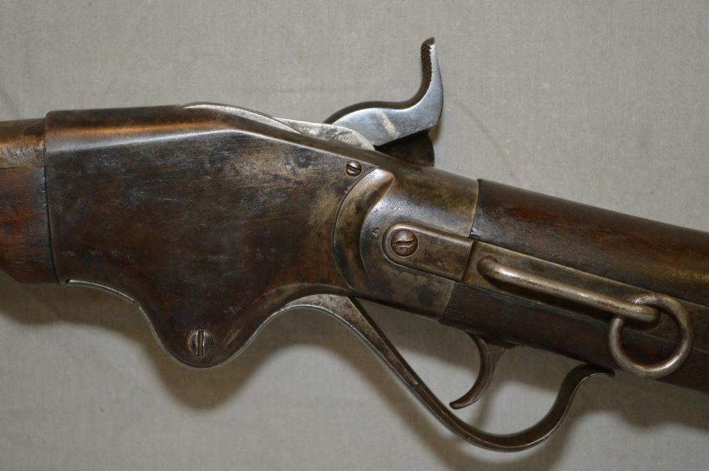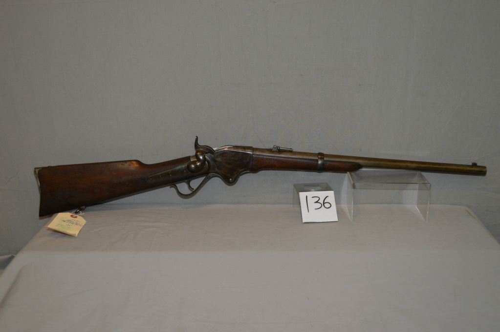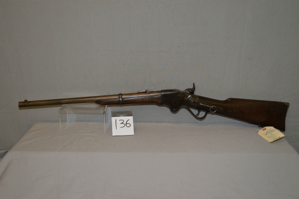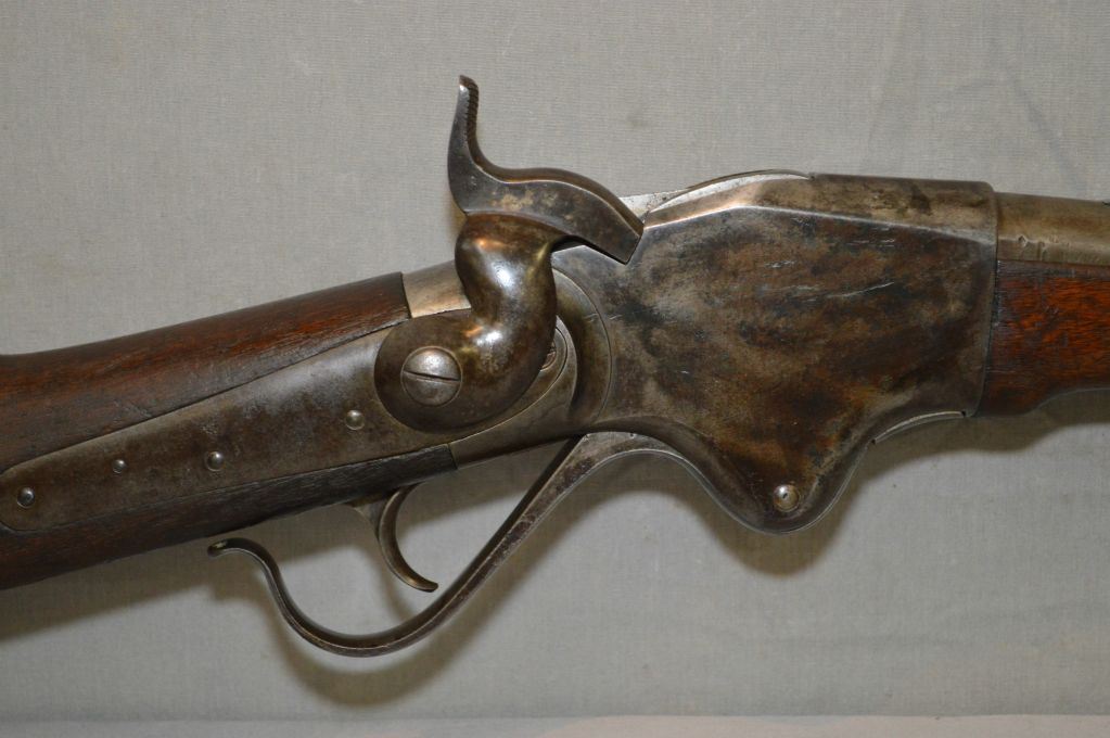 Spencer Civil War .52 Rimfire cal ( 56-56 cal ) Lever Action Saddle Ring Carbine w/ 22" bbl [ traces of fading blue finish turning brown, also traces of flaking case color turned silver, good wood, w/ metal butt plate w/cartridge tube trap, barrel sights, Made Circa 1863 - 1865, has saddle ring on left side & sling swivel at butt, as in Civil War models serial number range 11,000 - 61,000, ( 107) ] Ser # 56360 which fits in Civil War Range Antique NO Pal Req