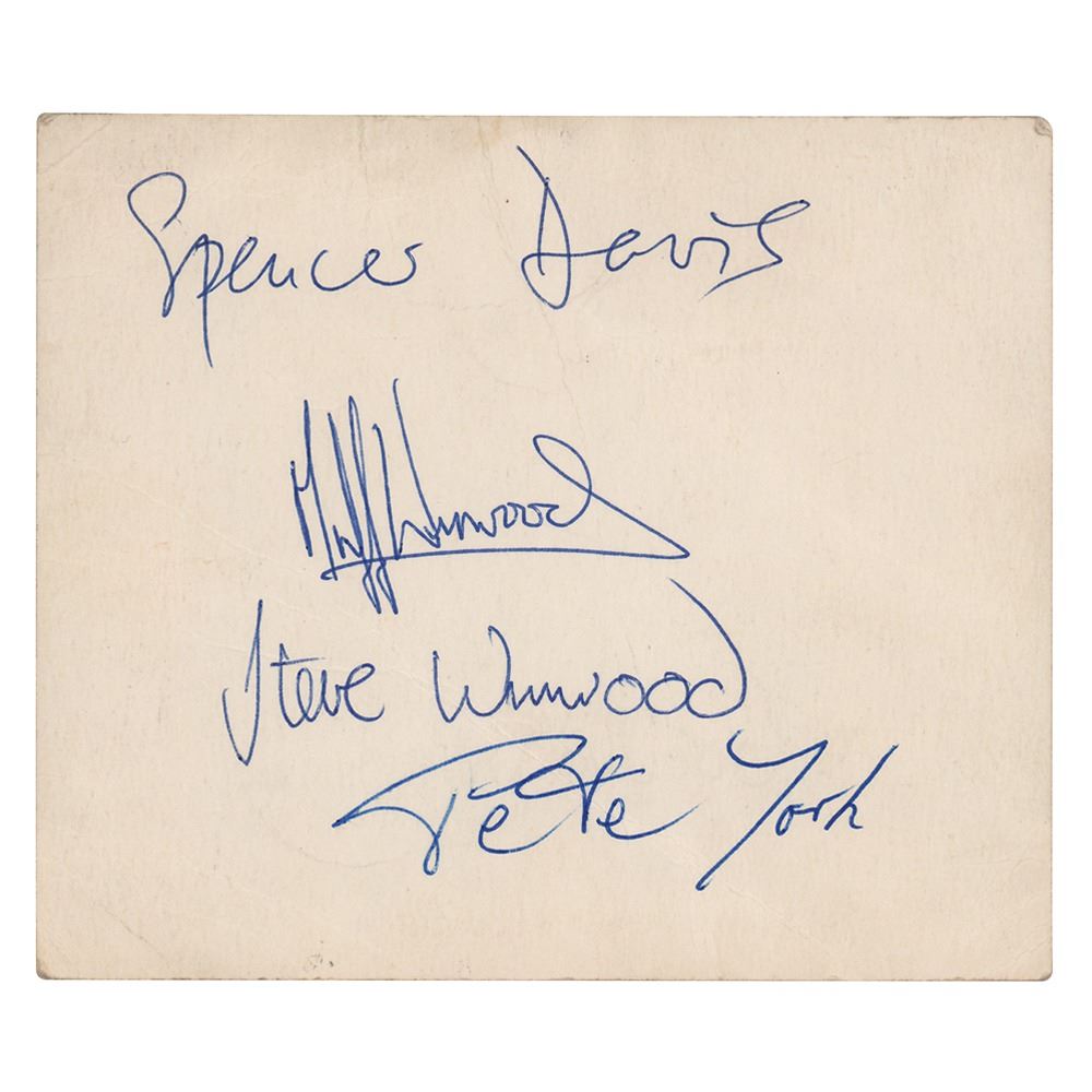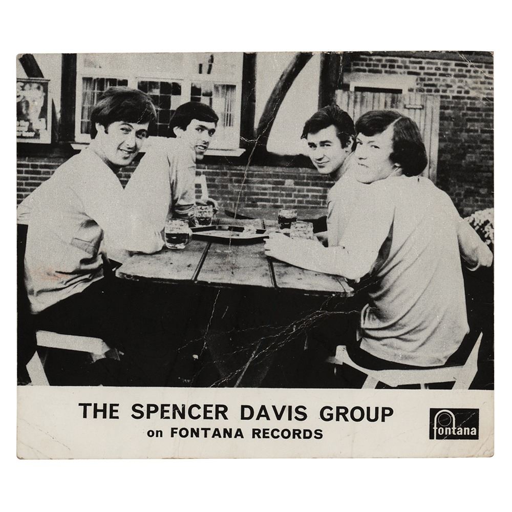 Vintage Fontana Records promotional card for The Spencer Davis Group, 5 x 4.25, signed on the reverse in blue ballpoint by Spencer Davis, Steve Winwood, Muff Winwood, and Peter York. In very good condition, with overall creasing.