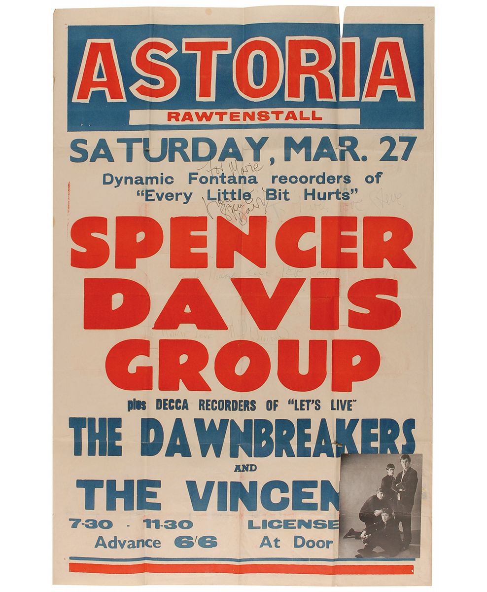 Color 20 x 30 poster entitled a Spencer Davis Group concert at the Astoria Theatre, in Rawtenstall, Lancashire, England, on March 27, 1965, signed and inscribed in ink and felt tip by Steve Winwood (first name only), Spencer Davis, Pete York, and Muff Winwood. A small promotional card is affixed to the lower right corner. In very good condition, with a few small separations along intersecting folds, tack holes to each corner, light wrinkling, scattered toning and soiling, and a couple signatures a bit light, but completely legible. Accompanied by a certificate of authenticity from Tracks.