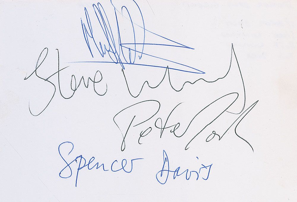 Ballpoint signatures of Steve Winwood, Spencer Davis, Pete York, and Muff Winwood on a white 5.75 x 4 card. In fine condition.