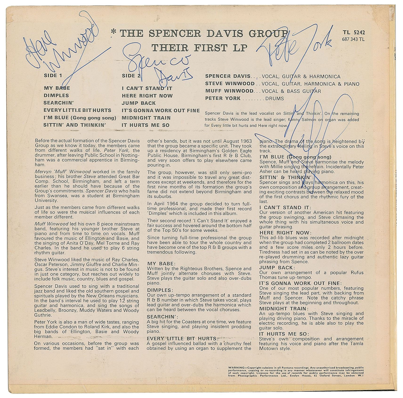 UK pressing of Their First LP by The Spencer Davis Group, signed nicely on the back cover in ballpoint by Spencer Davis, Steve Winwood, Muff Winwood, and Pete York. In fine condition, with minor surface loss to two corners. The record is included. Accompanied by a certificate of authenticity from Tracks.
