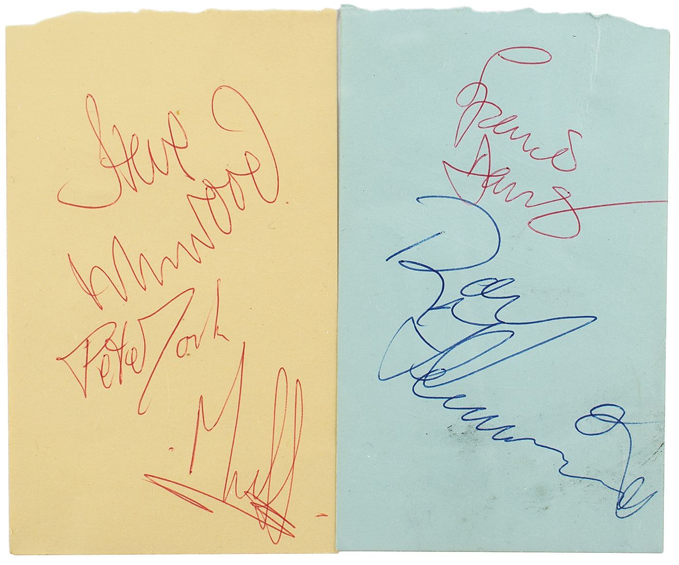 Vintage pair of blue and yellow album pages, 5.25 x 3.25 and 3.25 x 5.25, signed in blue or red ballpoint by the following members of the Spencer Davis Group—Spencer Davis, Steve Winwood, Muff Winwood, Pete York, and Ray Fenwick. In overall fine condition, with some soiling to the blue page.