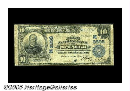 <B>Spencer, IA</B></I> - $10 1902 Plain Back Fr. 626 <B>The First NB</B></I> Ch. #(M) 3898<BR>We sold a nice Very Fine from the only other, and considerably more available bank from here in our 2005 FUN sale for $1,897.50. This institution failed in the Summer of 1927, leaving the community without a note issuing bank. It is represented in the census by a scant four pieces and should spark considerable bidder interest. Tonight's example is <B>Very Good-Fine</B></I> and retains an especially dark President's signature, although the Cashier's signature is not in evidence. This is just the type of scarce note from a strongly collected state that can precipitate a bidding war on the part of floor bidders.