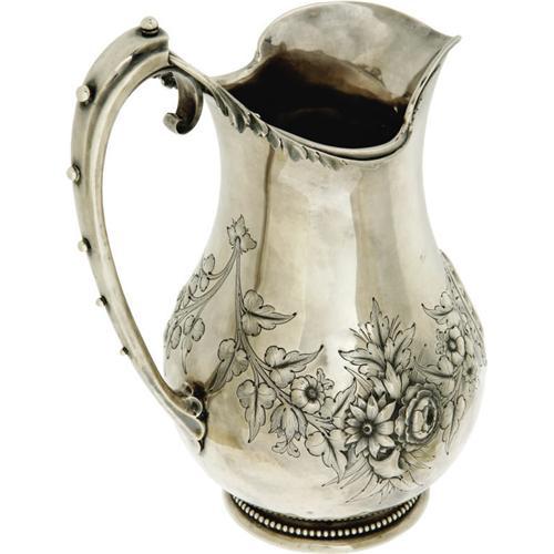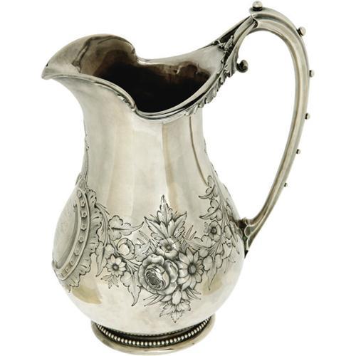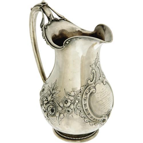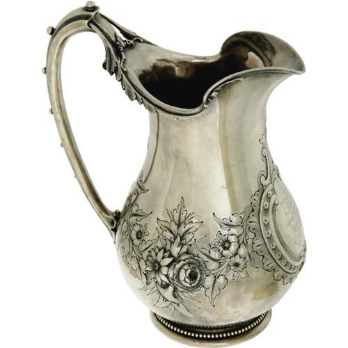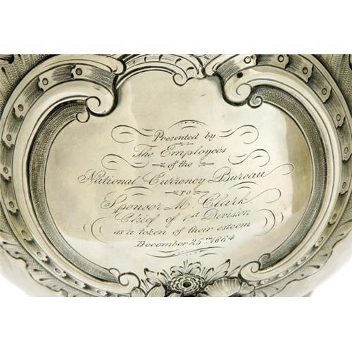 <B>Spencer M. Clark Presentation Pitcher.</B></I> This wonderful silver pitcher may well be the ultimate Fractional Currency collection association item. On Christmas Day in 1864, the employees of the National Currency Bureau, the institution that would become the Bureau of Engraving and Printing, presented their boss with an 11 ½” tall by 7 ½” wide silver pitcher with the following engraving:<BR><BR> <I> Presented by The Employees of the National Currency Bureau To Spencer M. Clark Chief of 1st Division as a token of their esteem December 25, 1864<BR></B></I><BR><BR>Spencer M. Clark, who was Superintendent of the National Currency Bureau and later the BEP (1862-1868), was a bit of an eccentric genius. He is best known for placing his own portrait on the Third Issue Five Cent Fractional Currency note. The note was first issued in January of 1865. Whether intended as an actual act of colossal vanity or merely as an insiders’ joke, Spencer Clark’s self-serving deed brought the wrath of Congress down on both Clark and the Bureau. The Act of April 7, 1866, which prohibited the placing of the portrait of any living person on U.S. currency, was a direct result of Clark’s misuse of his authority. <BR>Earlier in his career, Clark had also gotten his neck in a wringer over his association with Stuart Gwynn, a questionable character who was responsible for supplying both printing presses and bank-note paper to the National Currency Bureau. Both the Treasury Department and Congress investigated Gwynn and his relationship to Clark. The Treasury Department investigation created a 48-page official report submitted to the Secretary of the Treasury Salmon P. Chase that detailed various supposed misconducts by Gwynn and Clark. A second report went to Congress (38th Congress, First Session, House of Representatives, Report #140), courtesy of the Treasury Investigating Committee. Both hearings took place in the first half of 1864. <BR>Somehow, Clark retained his job. And later that year, he was given<BR>this pitcher by his employees. Our consignor obtained it years ago from his mother-in-law, who had been a next-door neighbor of Clark’s descendants, and she had received the pitcher as a gift. <BR>The bottom of the pitcher indicates that it was made of coin silver by Gorham between 1855 - 1860. Simply as “just another” 1860’s silver pitcher, this would be a solid four-figure item. With its direct currency connection, it is of inestimable value to the Fractional Currency community.<BR><BR><b>Shipping:</b> Coins & Currency (<a target="_blank" href="http://www.heritageauctions.com/common/shipping.php">view shipping information</a>)