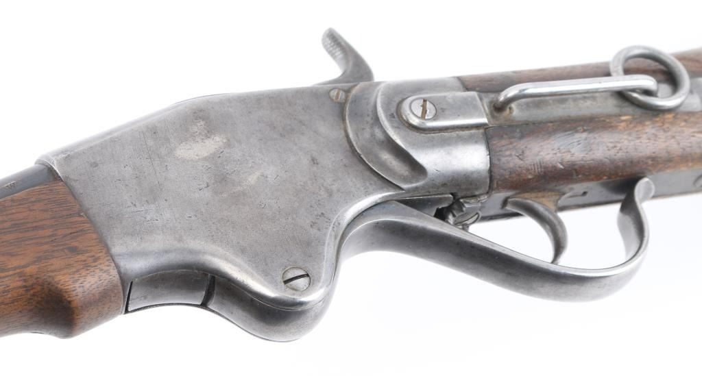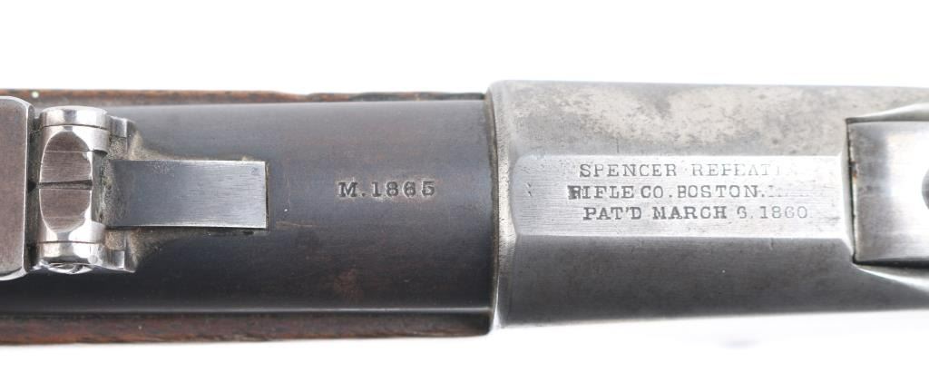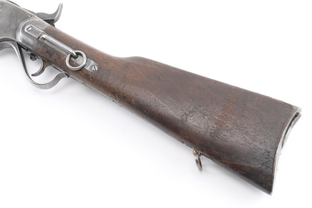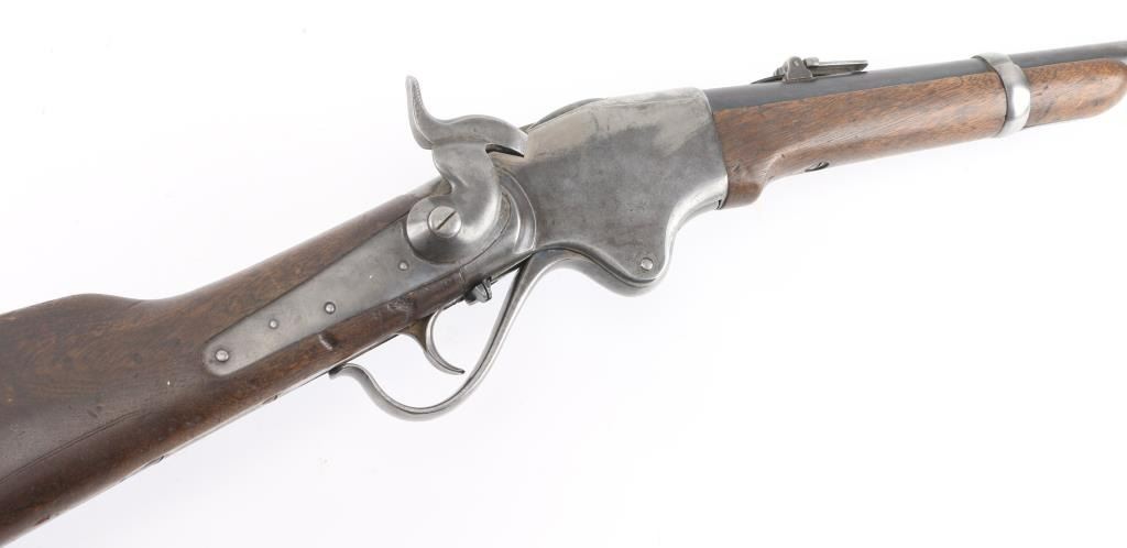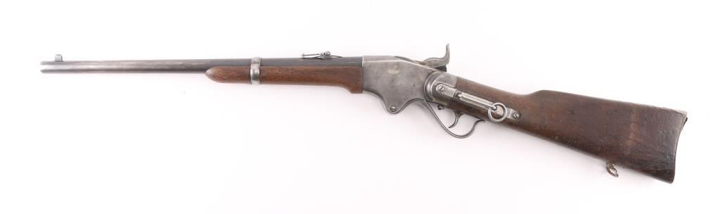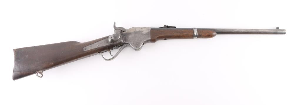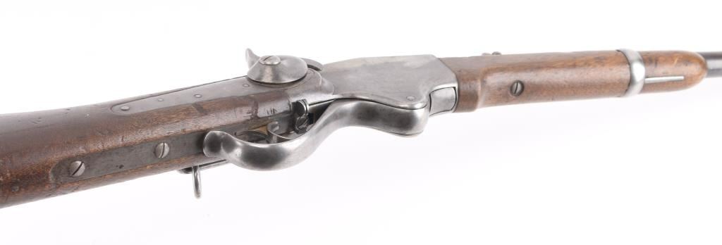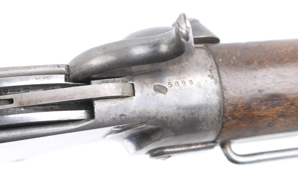 U.S. military contact breech-loading lever action repeating rifle chambered in .50 Rimfire, manufactured by Burnside Rifle Co. circa 1865. Features a 20" barrel with three land rifling, raised blade front sight, flip-up ladder rear sight graduated to 900 yards, rounded trigger, knurled hammer spur, 7 round tube magazine located in the buttstock, sling bar with saddle ring, 'J' shaped finger lever, smooth walnut forend with single barrel band, and straight grip shoulder stock with metal carbine buttplate, and sling swivel. Rifle retains minor traces of finish with the vast majority of the metal surfaces in the white. Drop block/hammer action is sound, the bore is good,with rifling present with some scattered lighgt areas of pitting. markings are good, and the wood stocks are near good with digs/chips, and a 3' section behind the sling swivel looks like its been replaced different wood, really not noticeable. There is a small ding in the barrel to the left of the rear sight. Condition is NRA Good. Antique Firearm