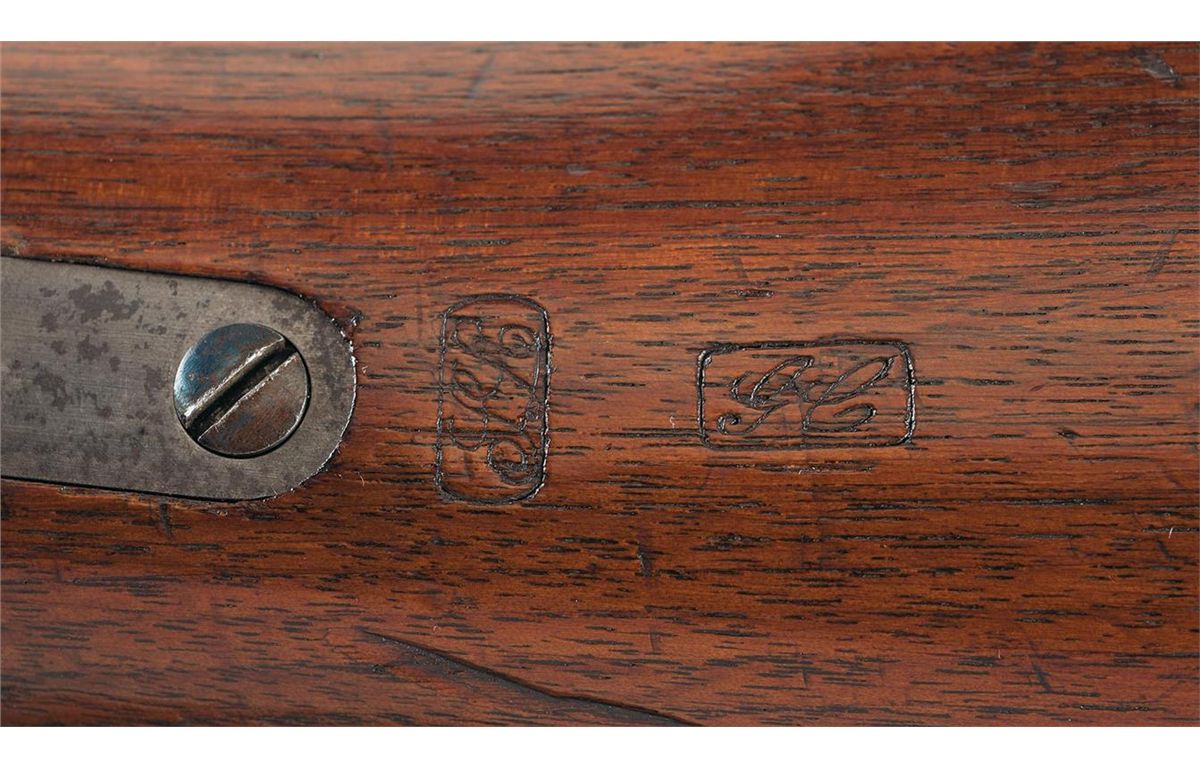 Fixed blade front sight and folding ladder rear sight graduated to 900 yards. The top of the receiver is marked "MODEL/1865" and "SPENCER REPEATING RIFLE/PATD MARCH 6 1860/MANUF'D. AT PROV. R.I./BY BURNSIDE RIFLE CO.", and the serial number is marked on top of the receiver next to the hammer. The left rear of the barrel is marked "J.L.C." and most parts are marked with a single letter inspection mark. Stabler cutoff, saddle ring and bar mounted on the left wrist and mounted with a smooth forearm and straight grip stock with a sling swivel. The left side of the stock behind the saddle ring bar is stamped with two crisp boxed cartouches and the left rear is stamped "T/112". Consignor notes state it may have been issued to Company C 4th Kentucky Infantry 3-1865, although there is no documentation to support the claim. The notes also reference to the U.S. Martial Arms Collector & Springfield Research Newsletter No. 85 page 22. Although most Model 1865 Spencer carbines were delivered too late for use in the Civil War, they were used extensively by cavalry regiments on the frontier until replaced by the U.S. Model 1873 Springfield Carbine.