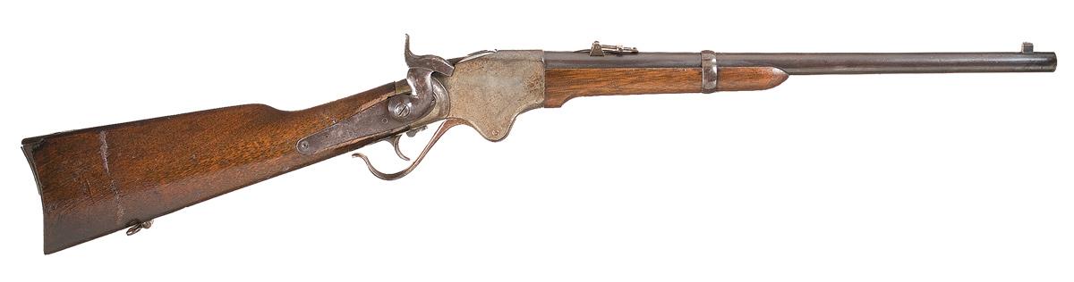 This is an excellent example of a Model 1865 Spencer Carbine with the Stabler magazine cut-off. The receiver, loading lever, hammer, and buttplate have a casehardened finish. The receiver has the cavalry sling bar and ring on the left side. The carbine is fitted with the characteristic Model 1865 sling swivel on the buttstock. The folding leaf sight is graduated to 900 yards and has a center sighting notch. The stock and forearm are oil-finished black walnut. The top of the carbine receiver is marked: "SPENCER REPEATING / RIFLE CO. BOSTON MASS / PAT'D MARCH 6 1860". The model designation, "M.1865" is located on the top of the barrel between the rear sight and the receiver. A "W" Ordnance sub-inspection mark is stamped on the left barrel flat. The boxed script Ordnance sub-inspector initials "EAW" are stamped in a vertical rectangle behind the sling bar and the Ordnance final inspector's script initials "DAP" are stamped in an oval behind the sub-inspection mark. Small sub-inspector initials "E.A.W." are located on the stock comb just ahead of the buttplate. The Model 1865 Spencer Carbine was issued in limited numbers in the final months of the Civil War. It was the primary carbine used by the regular U.S. Cavalry regiments (including the 7th Cavalry) in the west prior to the issue of the Model 1873 Carbine. Complete with an extra breechblock assembly.