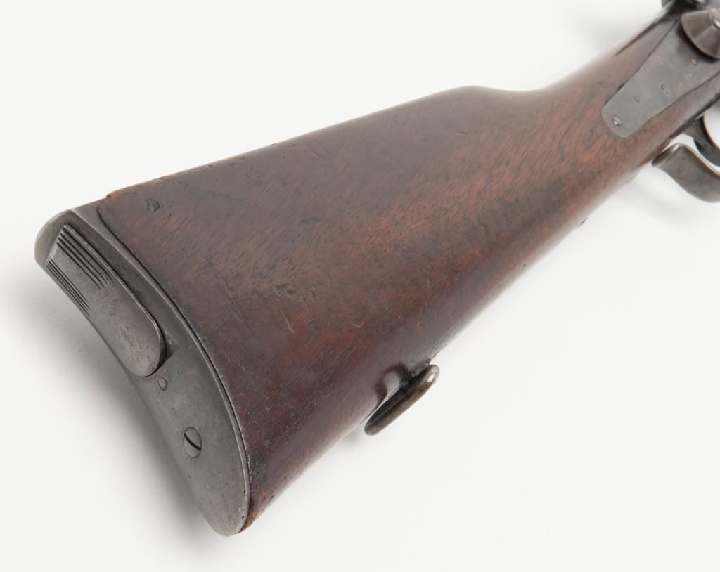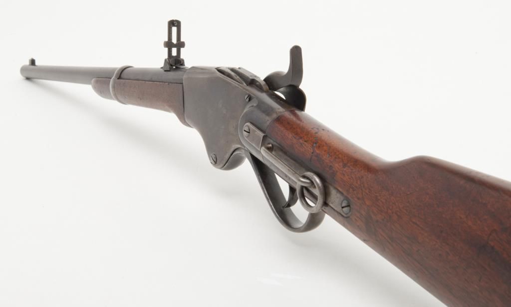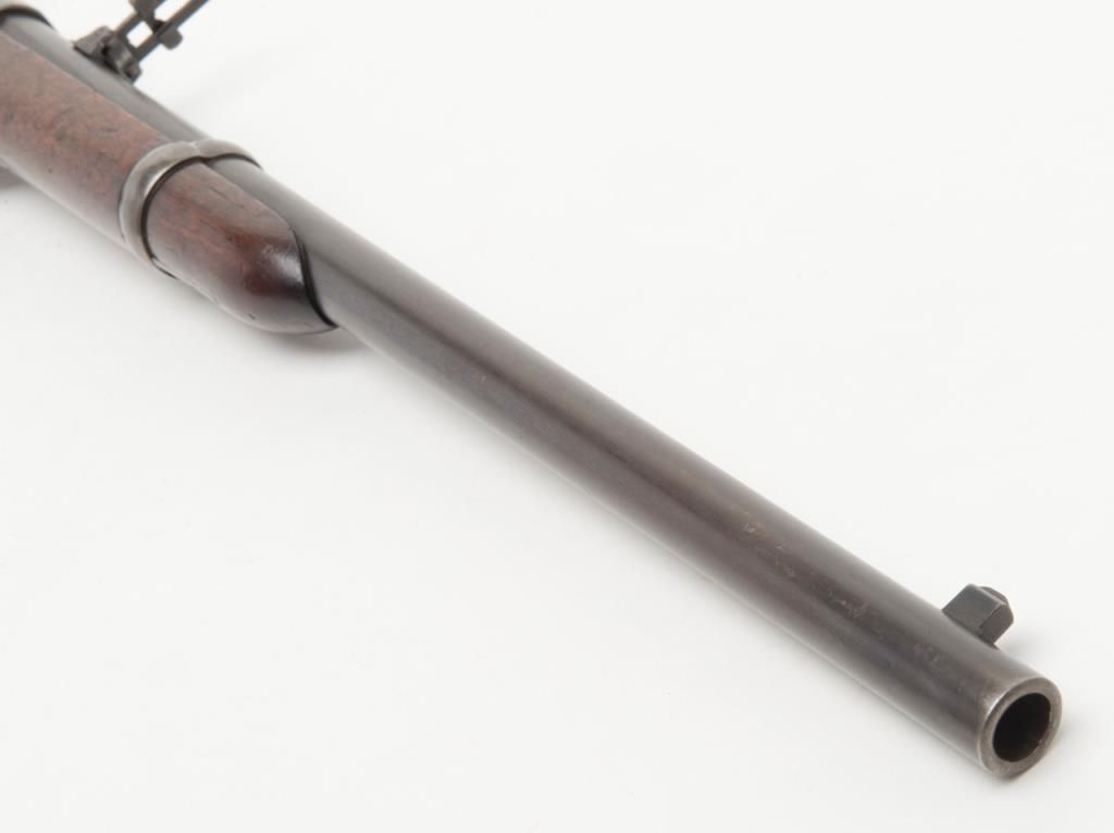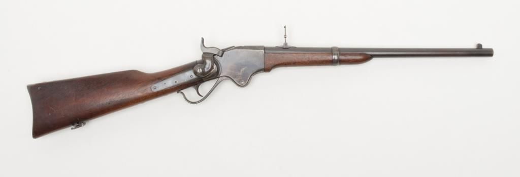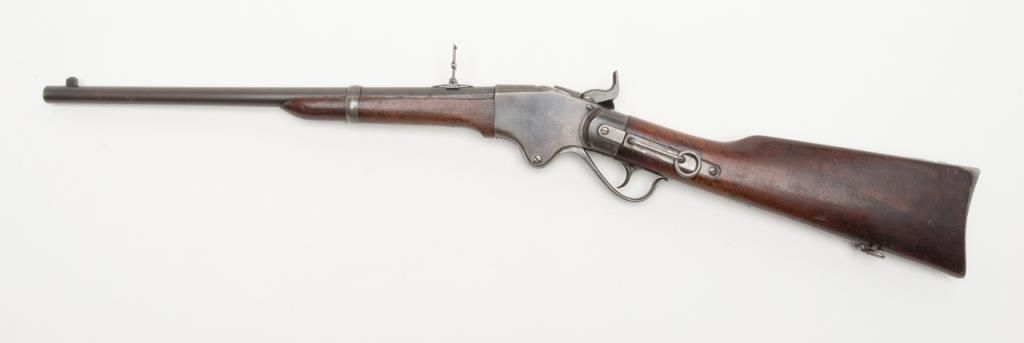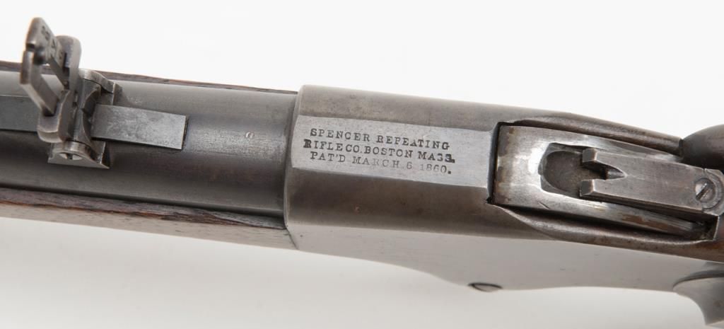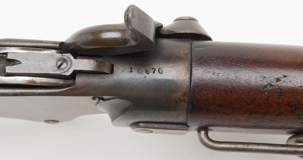 Spencer Model 1865 U.S. issued repeating carbine in very good plus original condition showing considerable original blue and case colors with visible cartouches, serial number 10670. The carbine shows 50%-70% original blue and casehardening with some natural aging, toning and normal handling. The stocks also are very good plus with a few dings, mars and small losses. The action works well and the bore is bright and there is some very bright colors where protected. Astrong 7.5 on a 1 to 10 scale. Est.: $3500-$7000