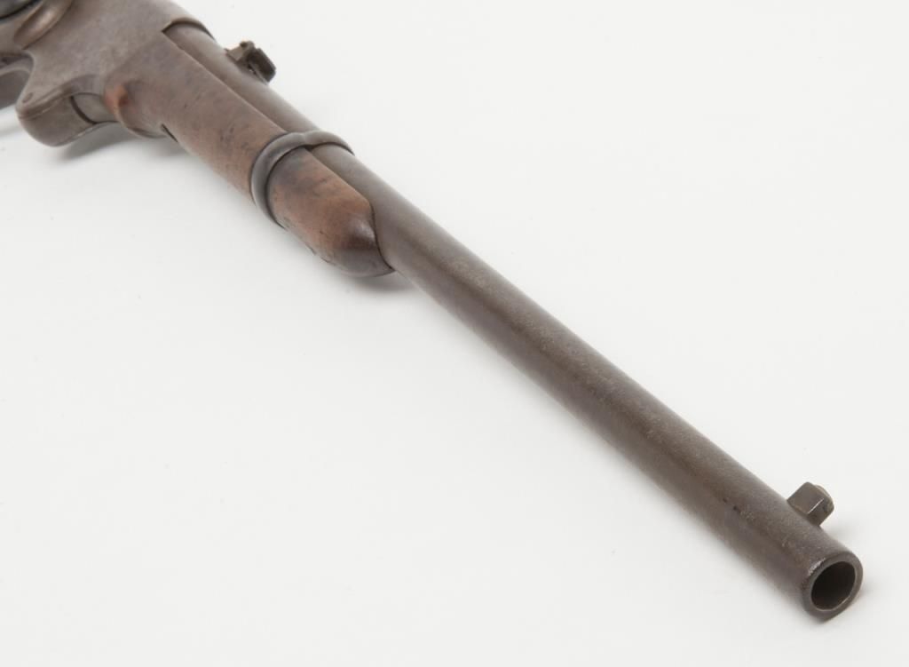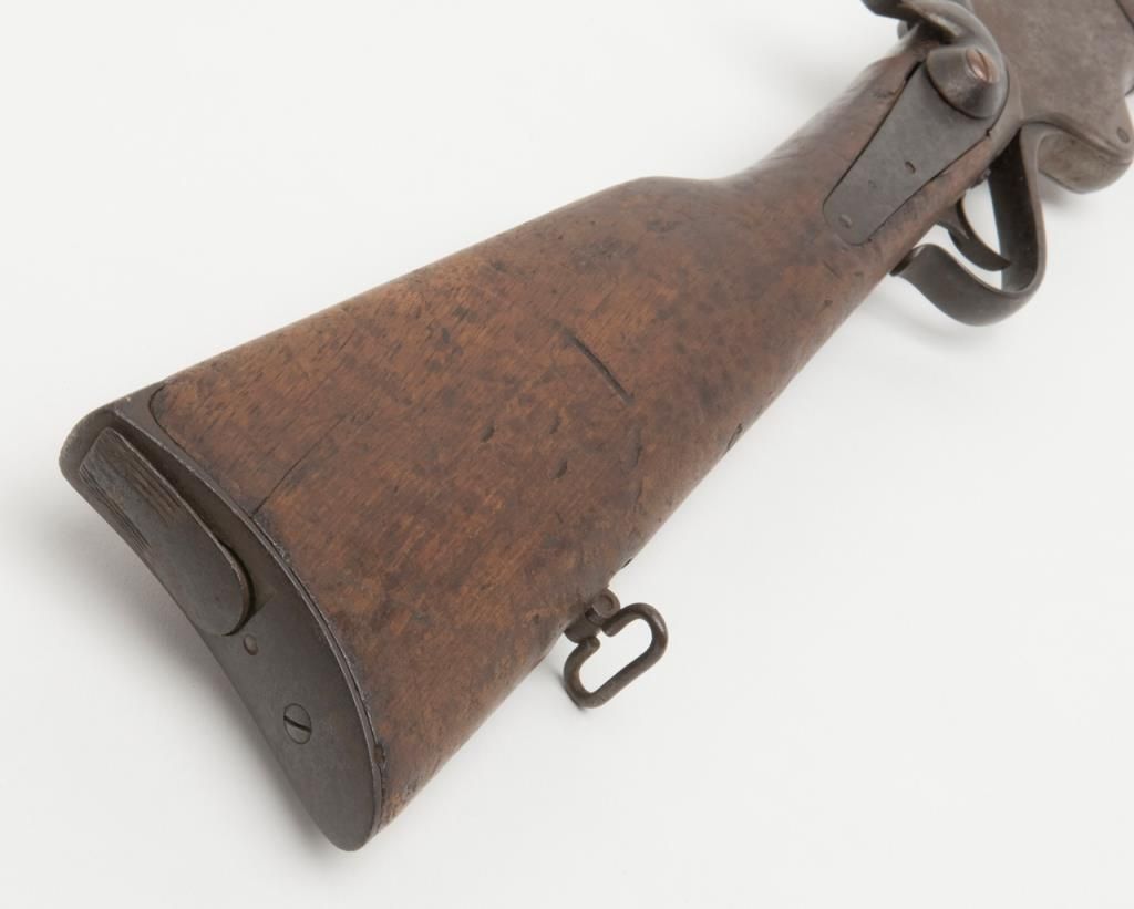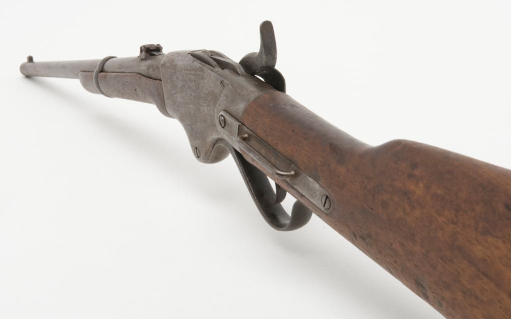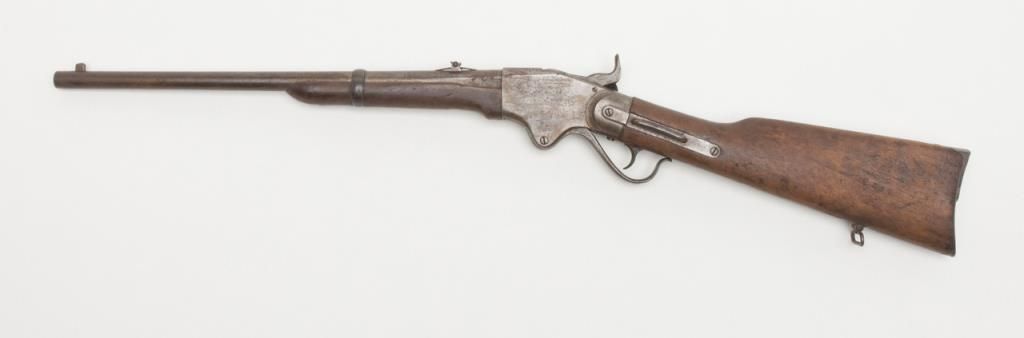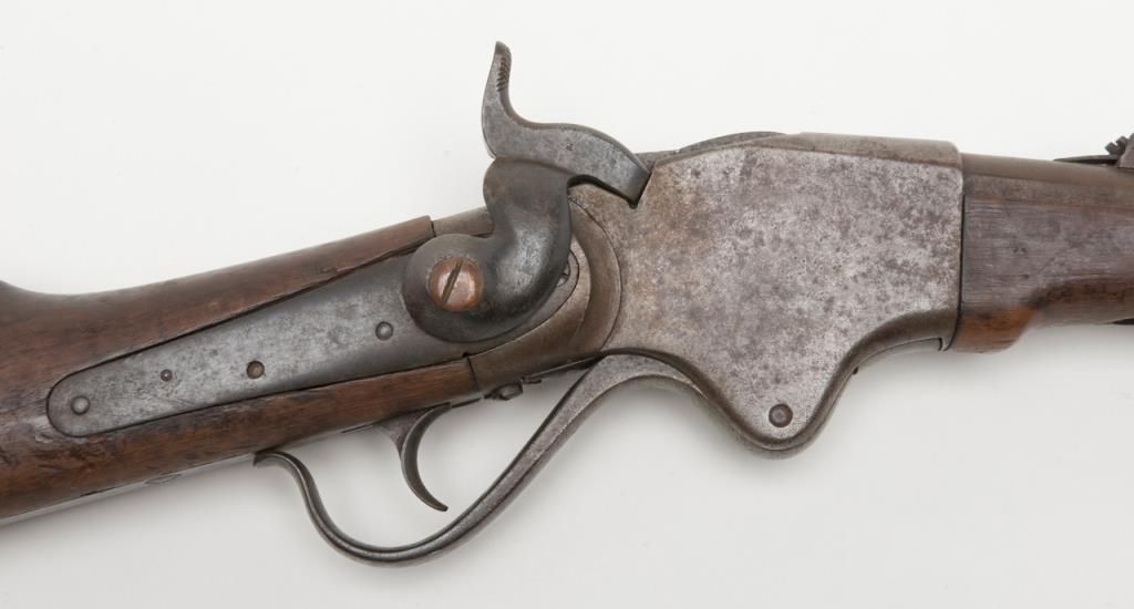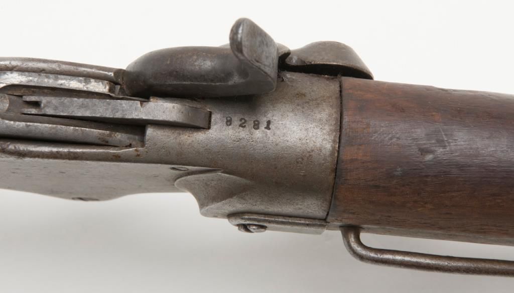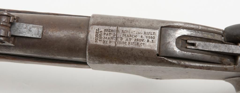 Spencer New Model 1865 lever action SRC, .50 cal., 20” round barrel, blue and case hardened finish, wood stocks, #8281 showing a well-worn good condition; dark patina with some scattered erosion and light surfaces rust on the receiver andbarrel, some scattered light pitting, good bore, visible markings, action not staying cocked; wood shows wear, scattered mars, dings, scratches and is missing the forend retaining screw; forend barrel band is present as is rear sling swivel and loading tube; Stabler cut off has been replaced with an old round head bolt, matching in many years of patina itself. (Antique). Est.: $1,000-$2,000.