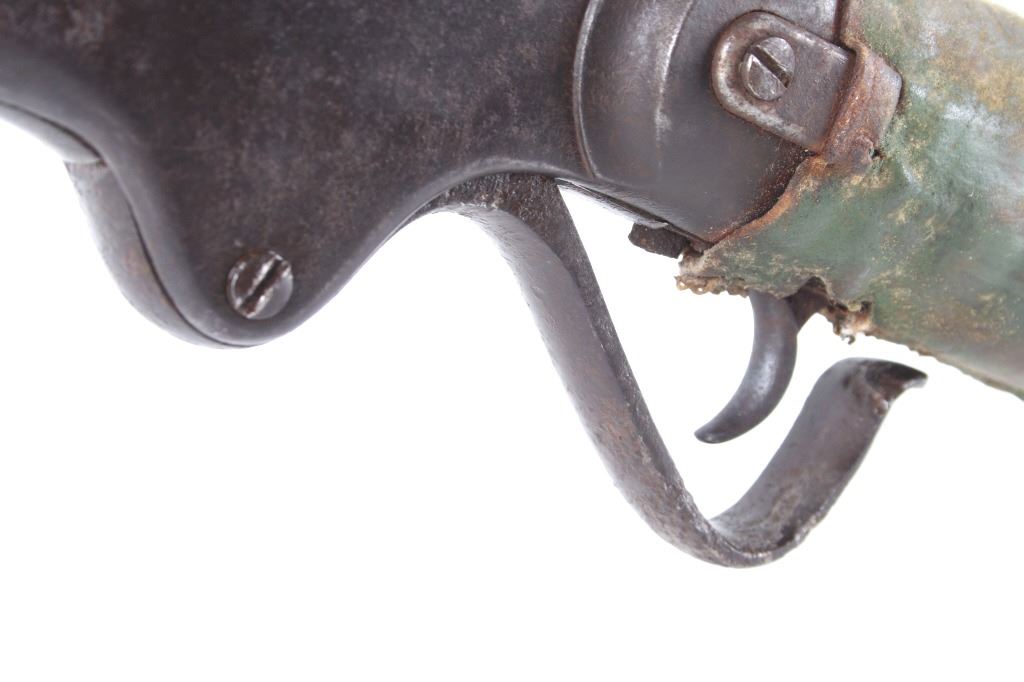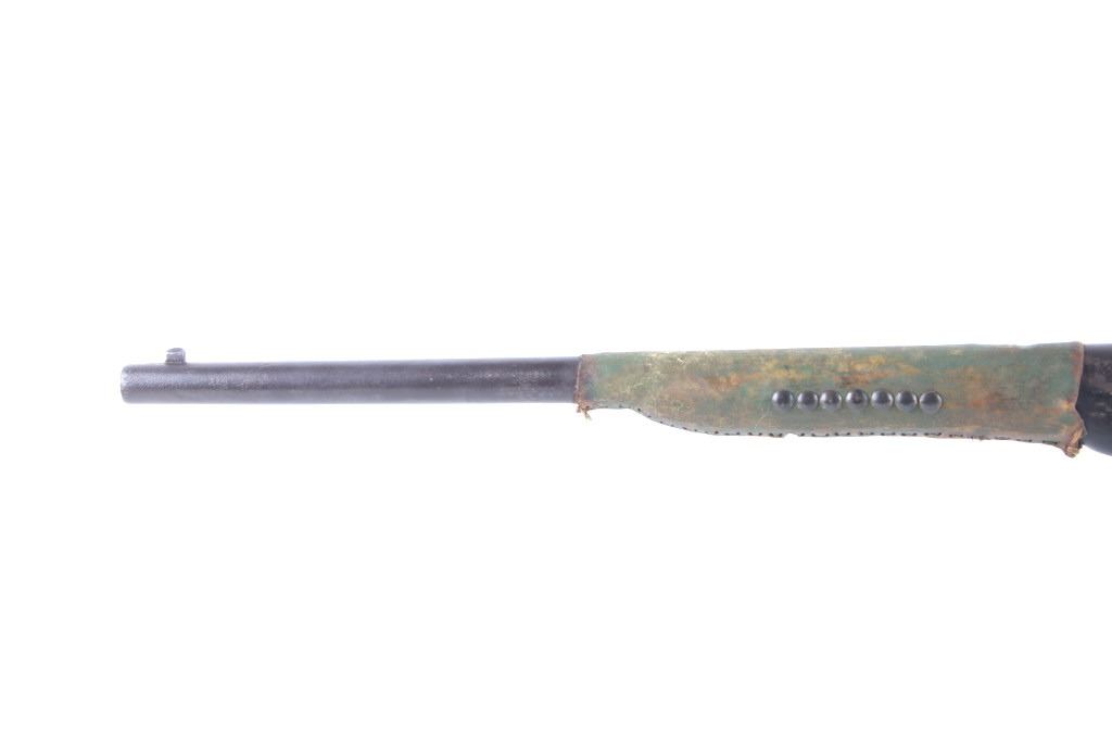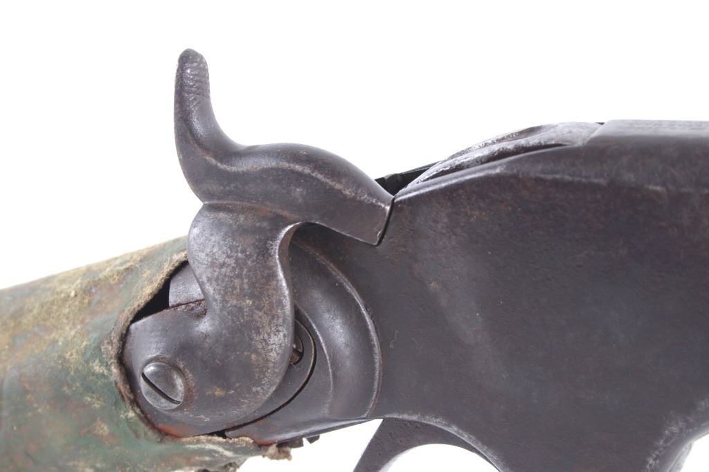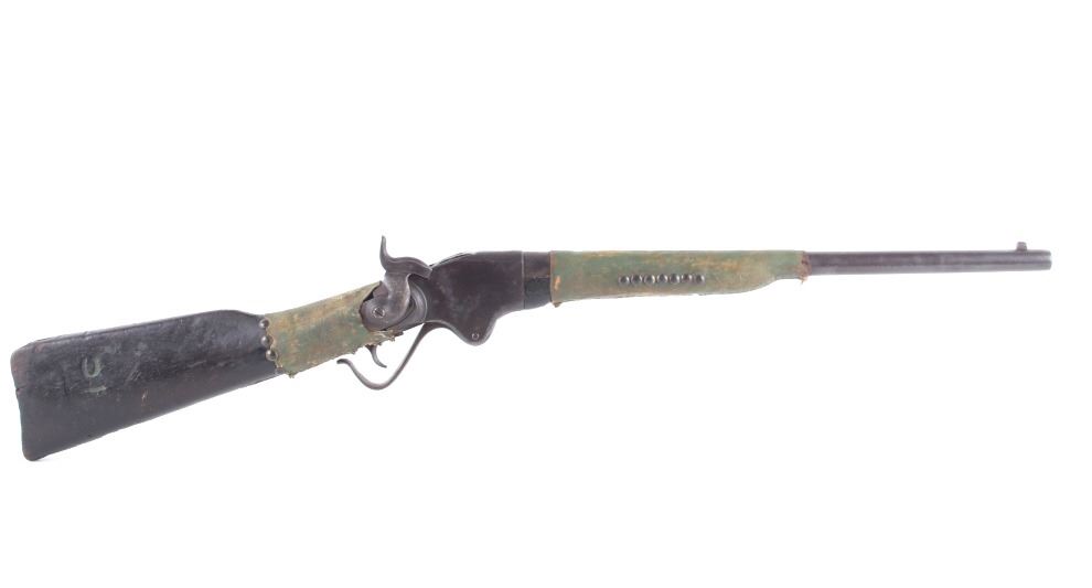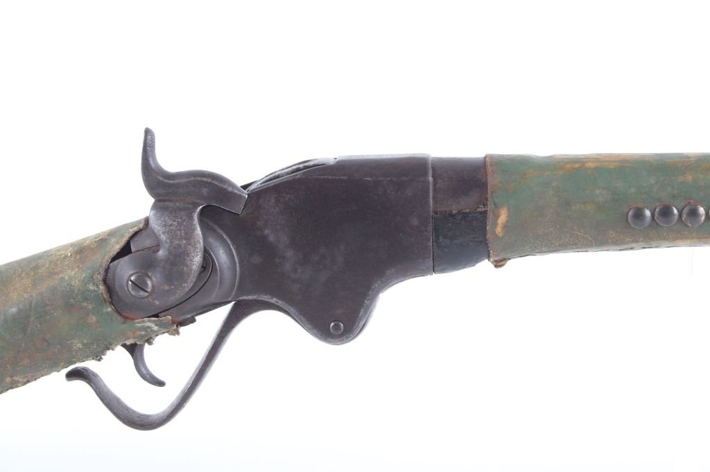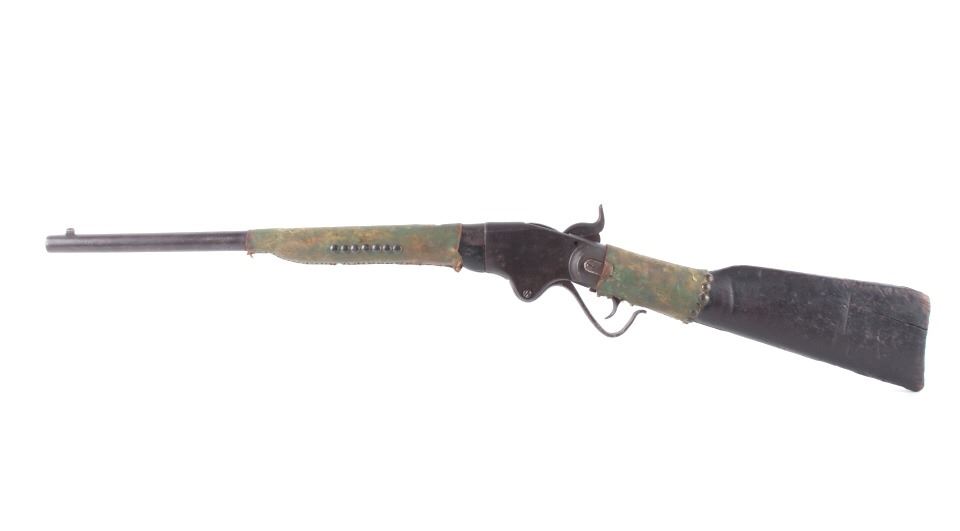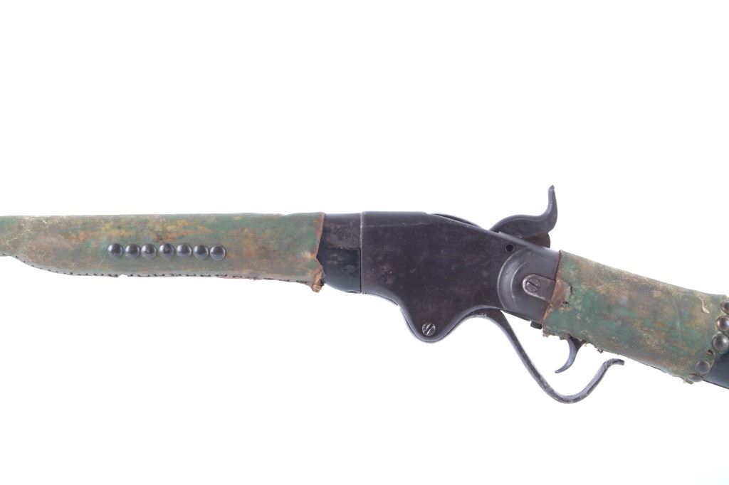 heavy patina to the internal parts and a dark bore with deep rifling intact. The hammer and trigger function correctly. The rear sight and barrel band are missing and covered with the forend rawhide. This is one of the most colorful Spencer Indian guns extant. It is known that many Spencers in Native hands found their way to the famed Battle of the Little Bighorn. Certainly this example was used long and hard leaving behind a wonderful link to America’s turbulent past. A superb example that is not only eye catching, but historically significant. The carbine weighs