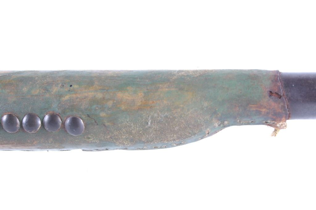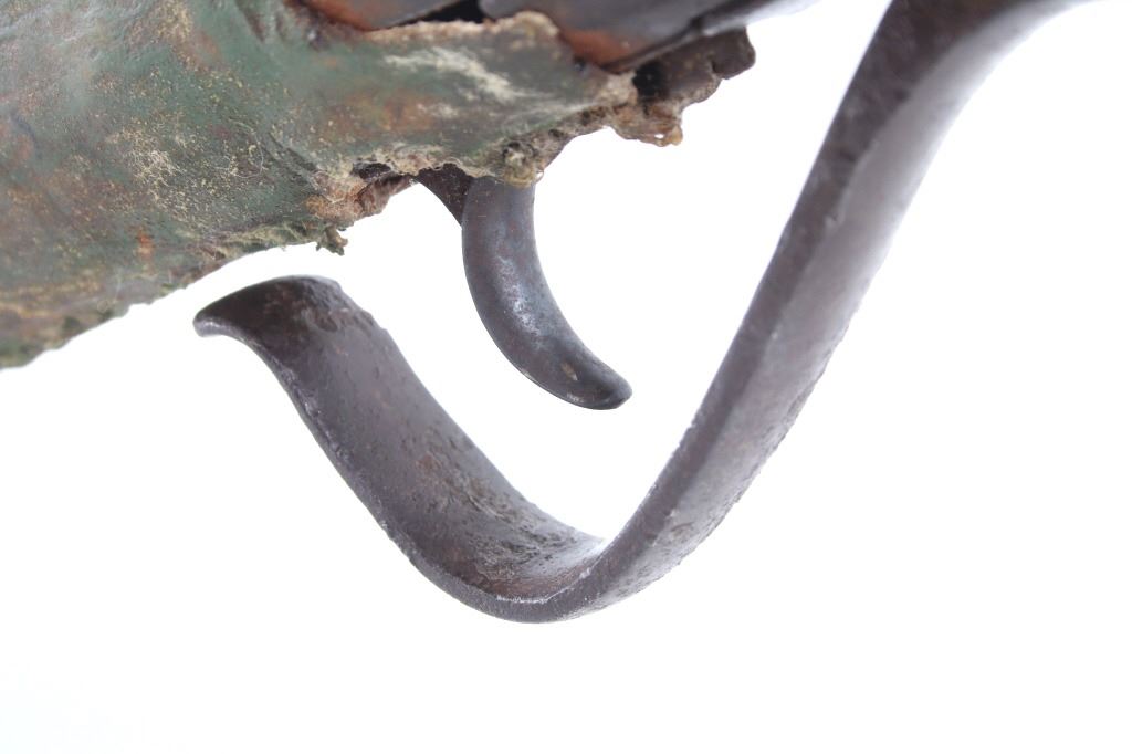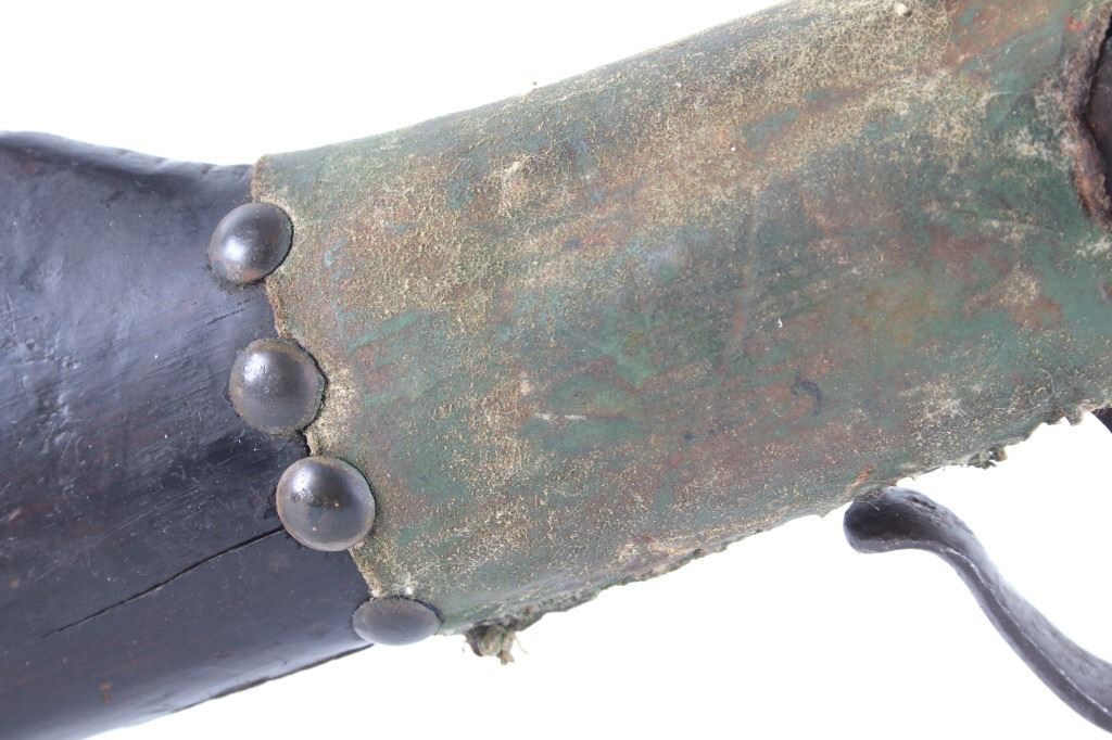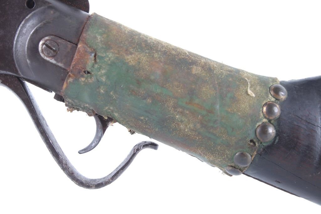 very deep, aged patina with no evidence of having been cleaned. The wrist and barrel are wrapped in sinew sewn buckskin that was obviously applied “wet” or uncured and stitched to shrink when dried for a tight and secure fit. The stitching was done on the bottom of both leather sections and is mostly intact with only small portions of thread erosion and additional wear behind the trigger. Interestingly, the leather was painted green with much still remaining with the balance worn to expose the natural buckskin hue underneath especially on the edges. There is a small row of very aged brass tacks along the sides of the forend leather and around the back of the wrist leather. The butt plate had been removed during its time of use (these frequently put to use as hide scrapers) with the surrounding wood now very aged and worn in where the butt plate had been previously. The hole in the stock for the magazine tube has a similar piece of dried buckskin covering the hole and held in place by three forged iron