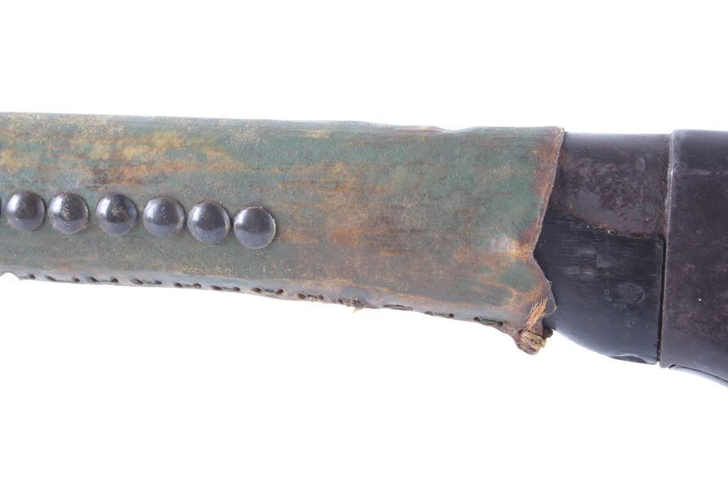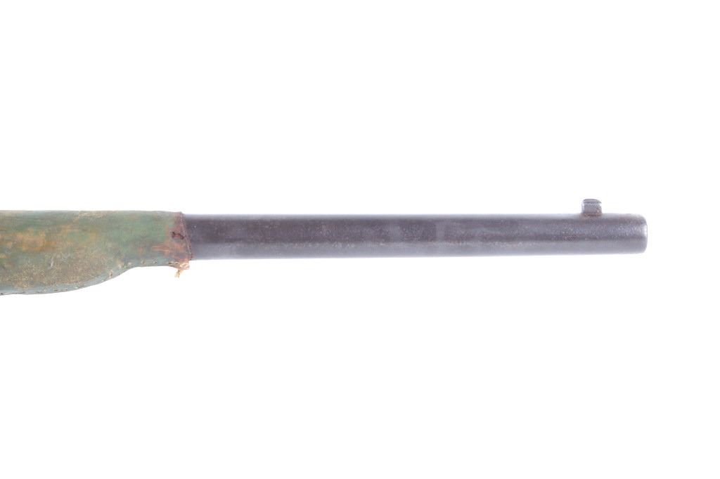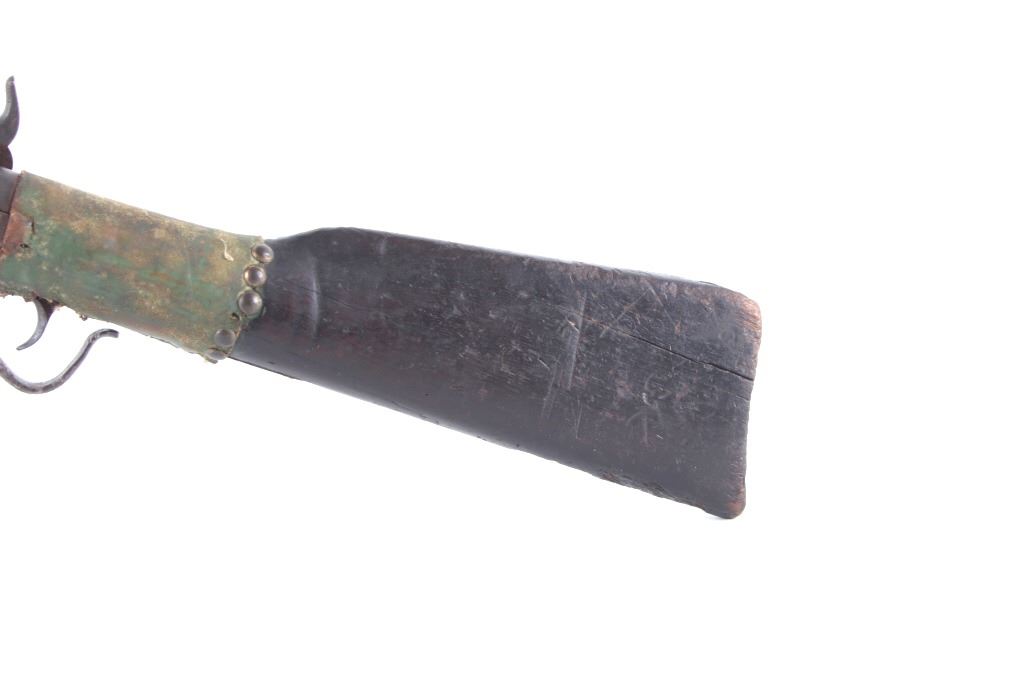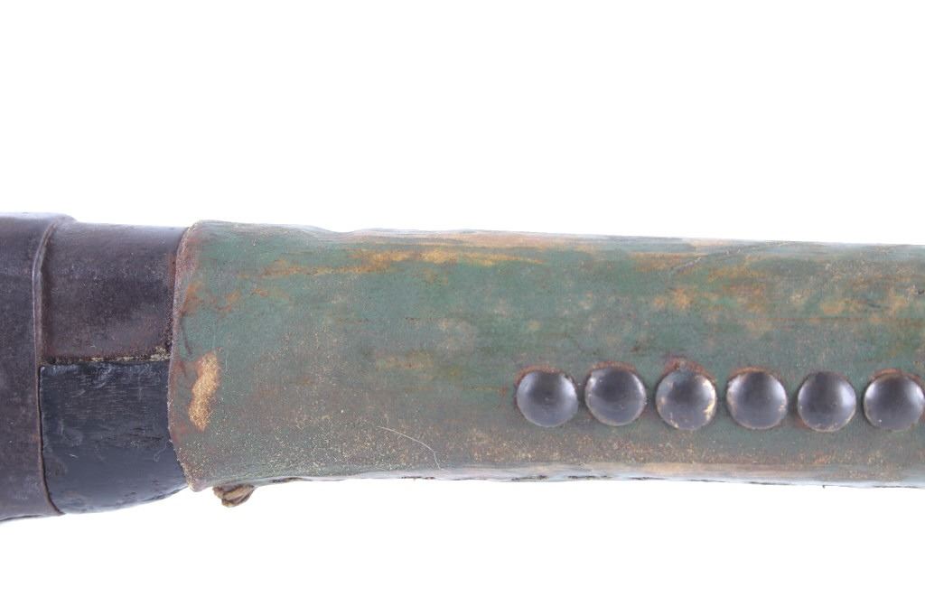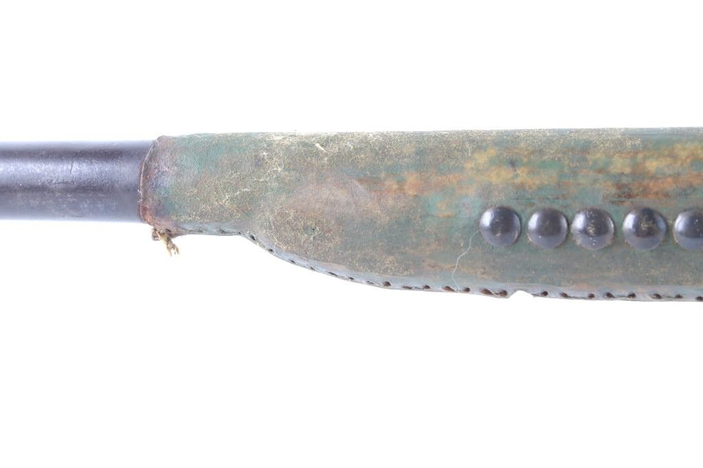 very deep, aged patina with no evidence of having been cleaned. The wrist and barrel are wrapped in sinew sewn buckskin that was obviously applied “wet” or uncured and stitched to shrink when dried for a tight and secure fit. The stitching was done on the bottom of both leather sections and is mostly intact with only small portions of thread erosion and additional wear behind the trigger. Interestingly, the leather was painted green with much still remaining with the balance worn to expose the natural buckskin hue underneath especially on the edges. There is a small row of very aged brass tacks along the sides of the forend leather and around the back of the wrist leather. The butt plate had been removed during its time of use (these frequently put to use as hide scrapers) with the surrounding wood now very aged and worn in where the butt plate had been previously. The hole in the stock for the magazine tube has a similar piece of dried buckskin covering the hole and held in place by three forged iron