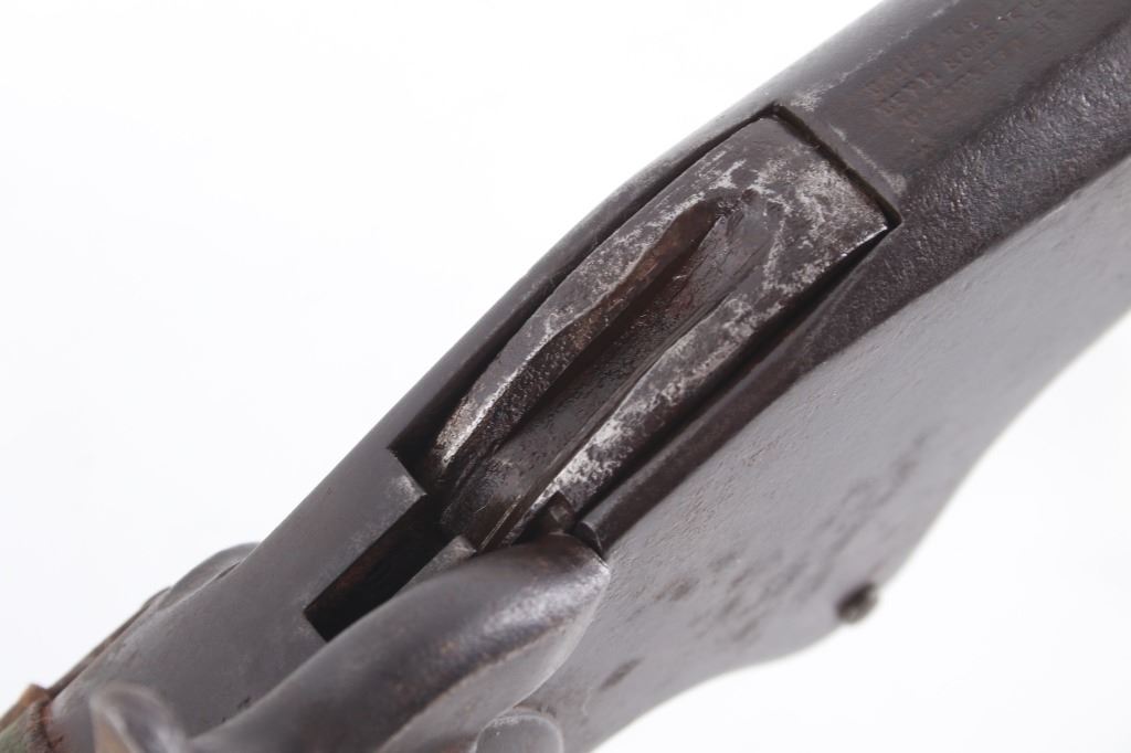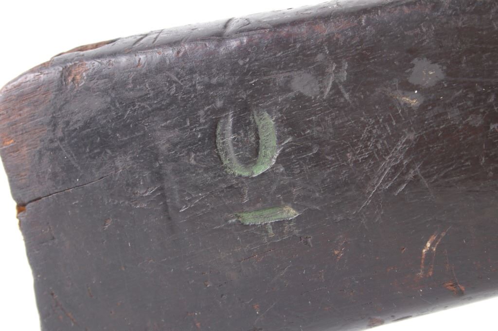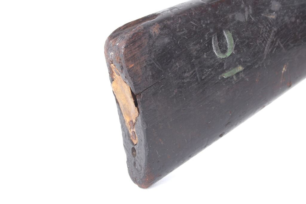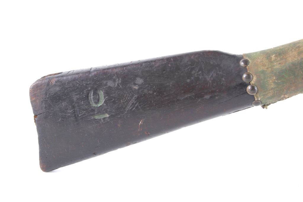 tacks. The stock also has had the sling swivel removed as well as the saddle ring which is partially covered with the wrist leather. The stock shows great age and wear. It is marked in the center of the right side with an indented or neatly carved horse shoe with a line underneath. This marking also has worn matching green paint inside. This may have been an owners identification mark or a clan marking. The action is stiff but with some light tapping with a mallet to the lever will open revealing a