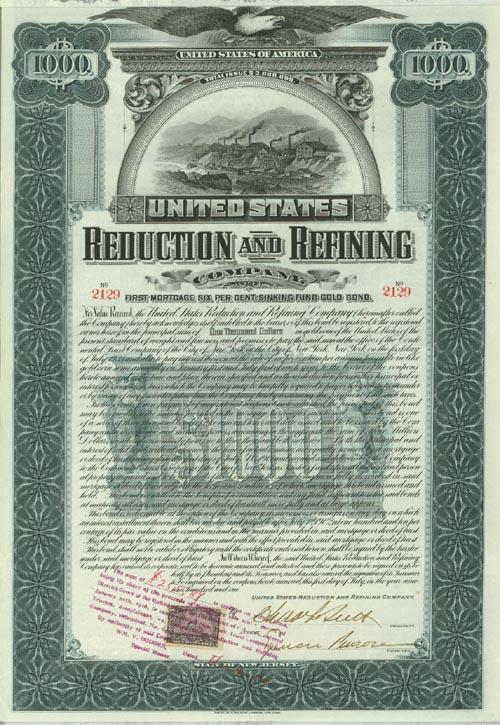 Spencer Penrose. DS. 1pp. 10" x 14 3/4". n.p. 1901. An "United States Reduction and Refining Company" bind for $1,000 signed by Spencer Penrose as company treasurer. There is a magnificent engraving of a processing plant at the top. One complete page of coupons is attached. A stamp cancellation affects the first two letters of the autograph, but the entire piece is in very fine condition overall.