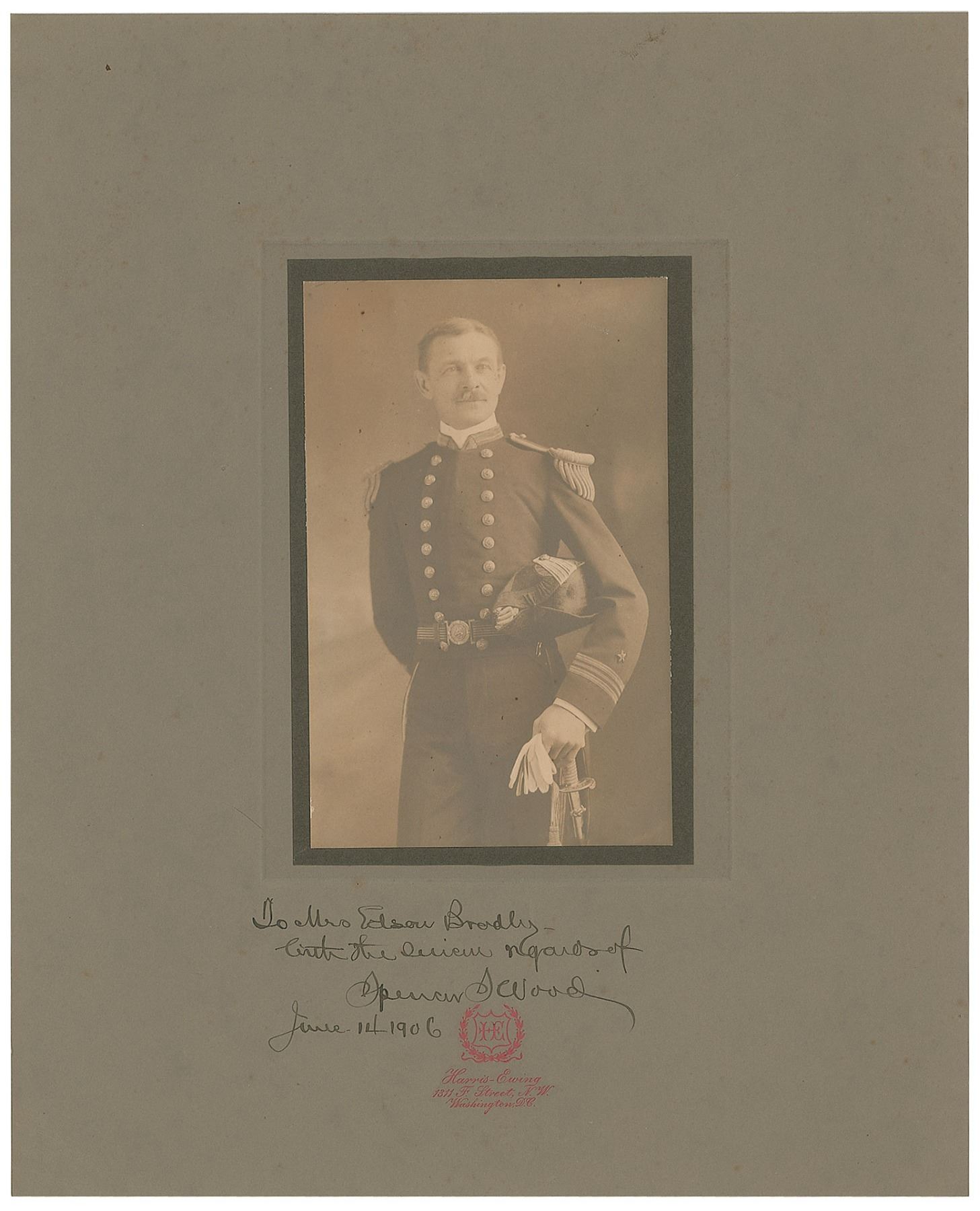 Distinguished United States Navy officer (1861–1940) who served in the Spanish–American War and World War I. Handsome matte-finish 4 x 6.5 three-quarter-length portrait of Wood in uniform, affixed to its original 11 x 13.5 Harris & Ewing mount, signed and inscribed on the mount in ink, "To Mrs. Edson Bradley, with the sincere regards of Spencer S. Wood, June 14, 1906.” In fine condition.