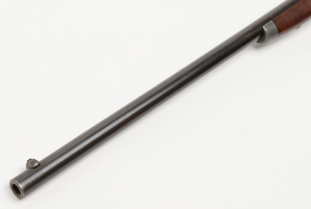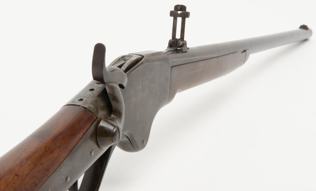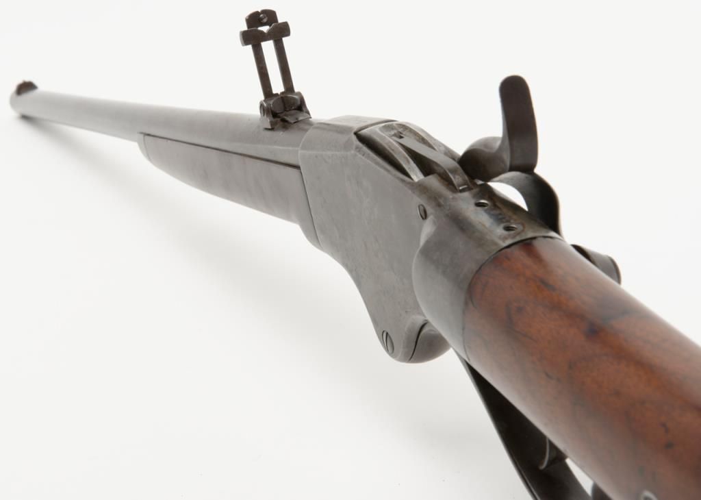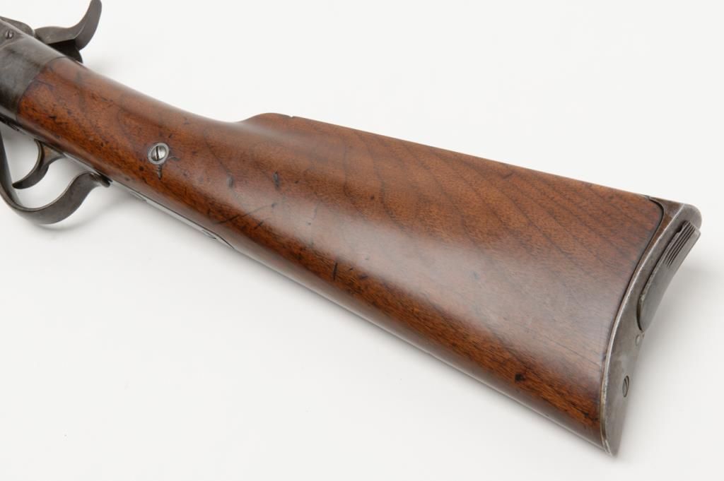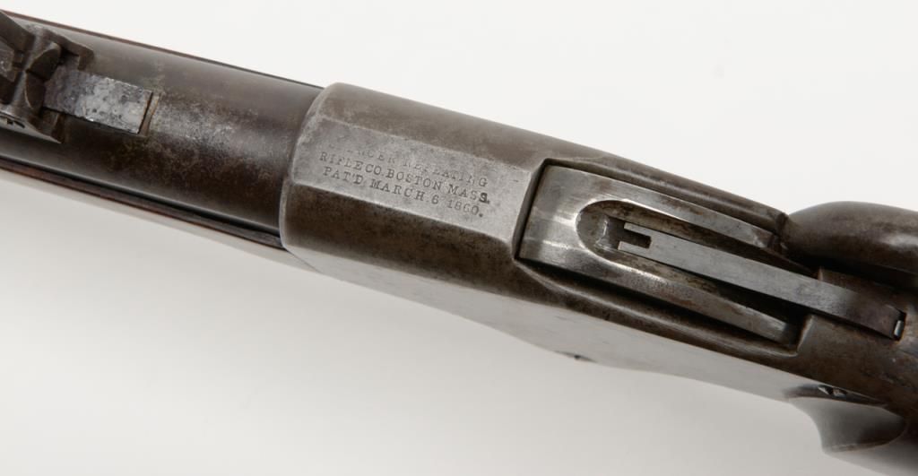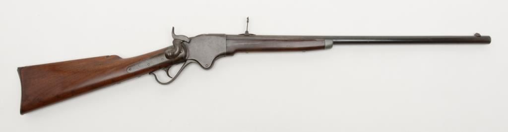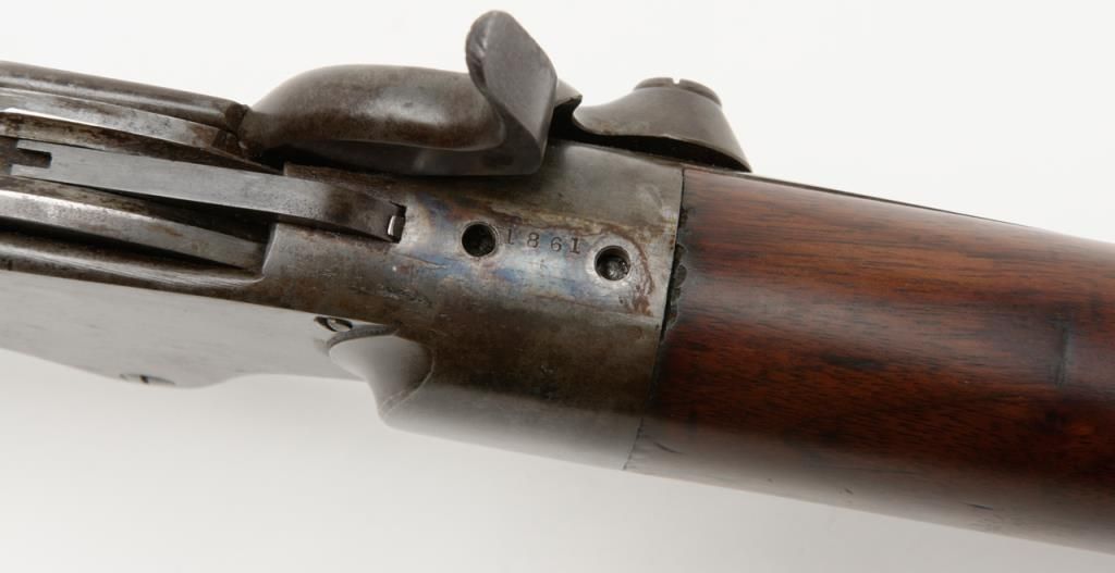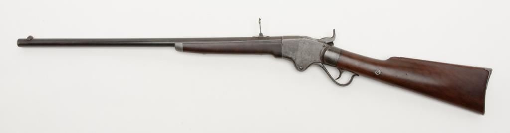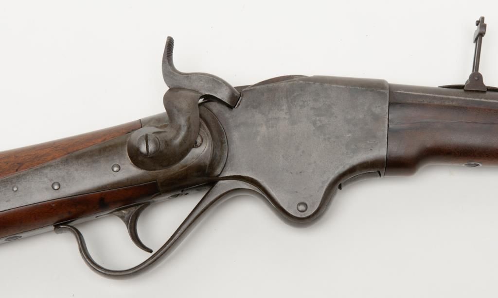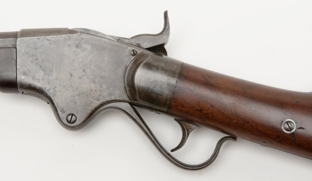 Spencer Sporting Rifle with 26” factory round barrel in .44 Caliber (.56-46 Spencer caliber) remaining in very good plus condition, serial number 1861. The barrel shows 30% to 50% original blue drifting to a grayish brown patina with some bright finish mixed in. The frame shows 10% to 20% case hardening mixed in with a silvery gray to brown patina with some light evidence of case hardening and rainbow colors where protected. The stocks have been lightly refinished which is well done but are down slightly from the metal. The tang shows 2 holes one in front and one behind the serial number from a tang sight that is missing. The address on the frame is very good and still sharp and clear with Spencer Repeating Rifle Company, Boston, Mass address and 1860 date. The original front and rear sights are retained and the action works well. The bore is bright and at least very good plus to near fine. An original magazine is retained. The interior of the action shows great case hardening. A very nice Spencer sporting rifle that could’ve made the Civil War or been used on the early frontier possibly as a Buffalo gun. Est.: $2500- $5000
