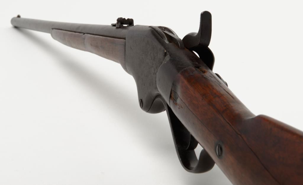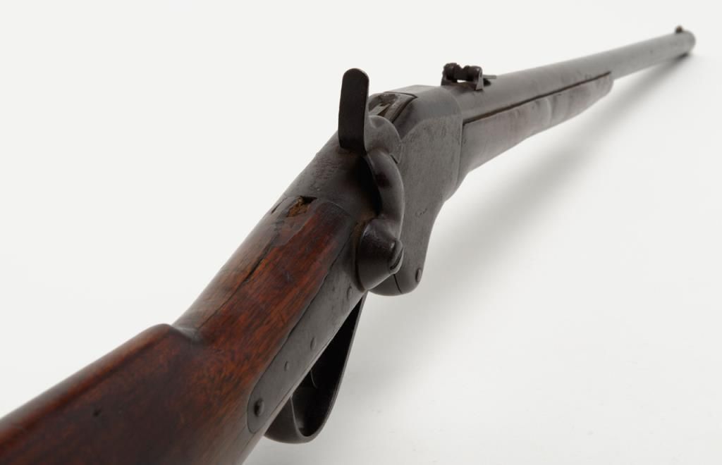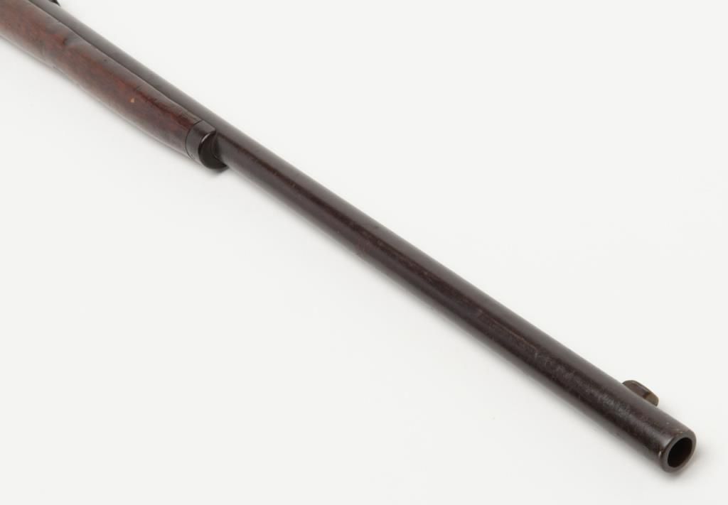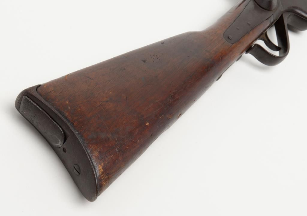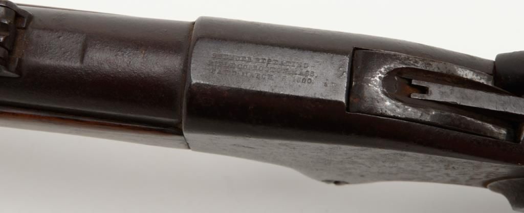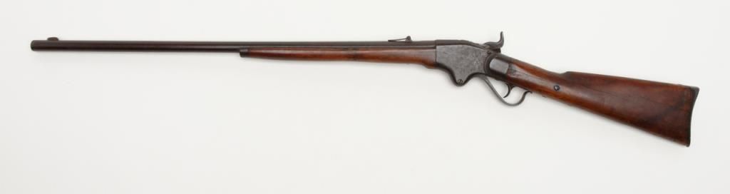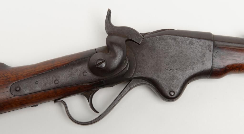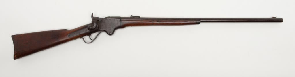 Spencer Sporting rifle in .56-52 Spencer caliber with 30” round barrel, serial number 2358 belonging to Elias Reigle member of 66 Illinois infantry aka “The Western Sharpshooters” and originally sold by Little John’s for hisdescendants along with his inscribed Henry rifle. Also sold at that time was his 66 Illinois sharp shooter corps badge, and other ephemera including photographs of Reigle. (Refer Little John’s Important Firearms auction January 9, 2005,session 1 item 105 and 106). This rifle shows a dark brown patina finish with some scattered light to moderate erosion and pinprick pitting. The stock shows a split by the top of the frame and small losses of wood around that area. The woodwould be rated as only fair. The action is good and the bore is good. The rear sight is a ladder type addition similar to Henry rifle. A large documentation folio is included with this rifle and a signed affidavit transferring this rifle atpoint of original sale. The affidavit traces the ownership directly to the hands of Elias S. Reigle through family members. The Western sharpshooters served with distinction in the Civil War and acted as bodyguards for General Sherman along with