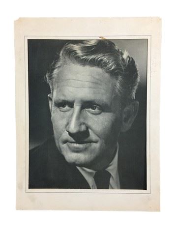 A vintage black and white headshot (ca. 1950) of Spencer Tracy in a cardboard picture frame. There are creases, stains, tape and minor edge wear damage. Very Fine. (9" X 12").