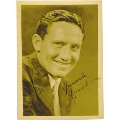 <B>Spencer Tracy Autographed Picture.</B></I> Striking matte finish 5" x 7" portrait of Spencer Tracy, circa 1935, about to begin his MGM tenure that won him two Oscars and fully established him as the screen's most respected male star. Signed in black fountain pen, "Sincerely Spencer Tracy, " with a slash through each S" so they resemble dollar signs. An intriguing portrait, especially in the smile, that somehow reminds you of Tracy's Manuel from <I>Captains Courageous</B></I> and his Mr. Hyde simultaneously. Excellent condition.<BR><BR><b>Shipping:</b> Flat Material, Small (<a target="_blank" href="http://www.heritageauctions.com/common/shipping.php">view shipping information</a>)