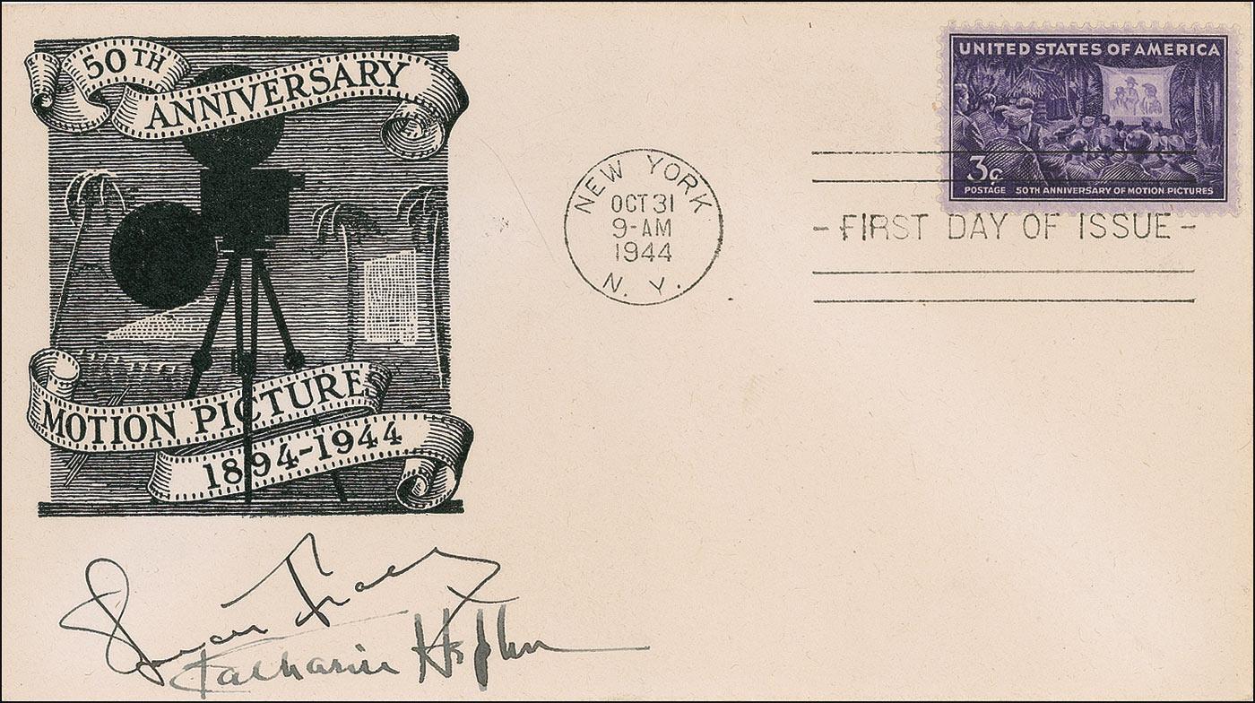 FDC with a cachet honoring the 50th anniversary of motion pictures, signed in fountain pen under the cachet by Spencer Tracy and Katharine Hepburn. In fine condition, with a light overall shade of toning. This early combination of Hepburn and Tracy is uncommon and desirable. Pre-certified PSA/DNA and RRAuction COA.