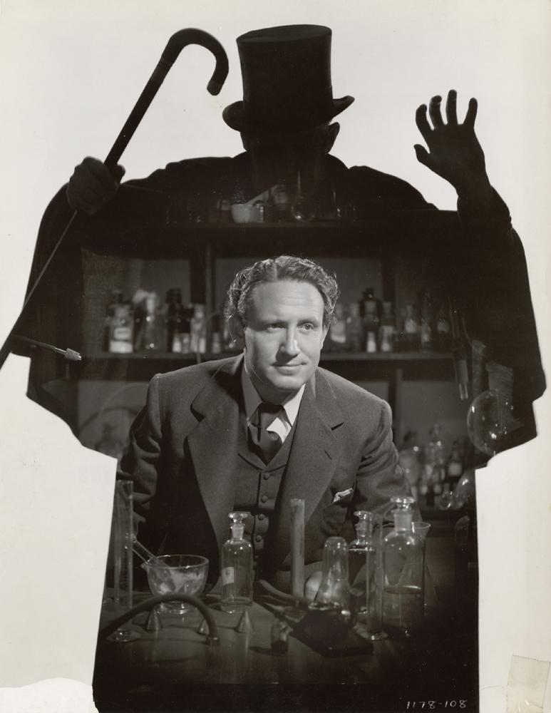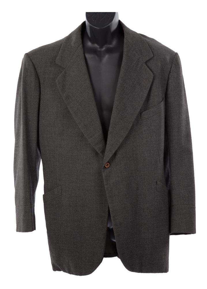 (MGM, 1941) Grey wool single breasted coat worn by Spencer Tracy as “Dr. Jekyll” in Dr. Jekyll and Mr. Hyde. Internal “Metro-Goldwyn-Mayer” tag is handwritten in ink, “Spencer Tracy 1178 9665.” Small hole at the left cuff; otherwise, remarkably good condition overall.
