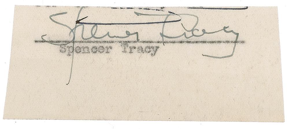 Vintage ink signature, “Spencer Tracy,” on an off-white 3 x 1.5 onionskin slip clipped from a larger document. In fine condition, with a stray ink mark through top part of signature, and irregular edges.