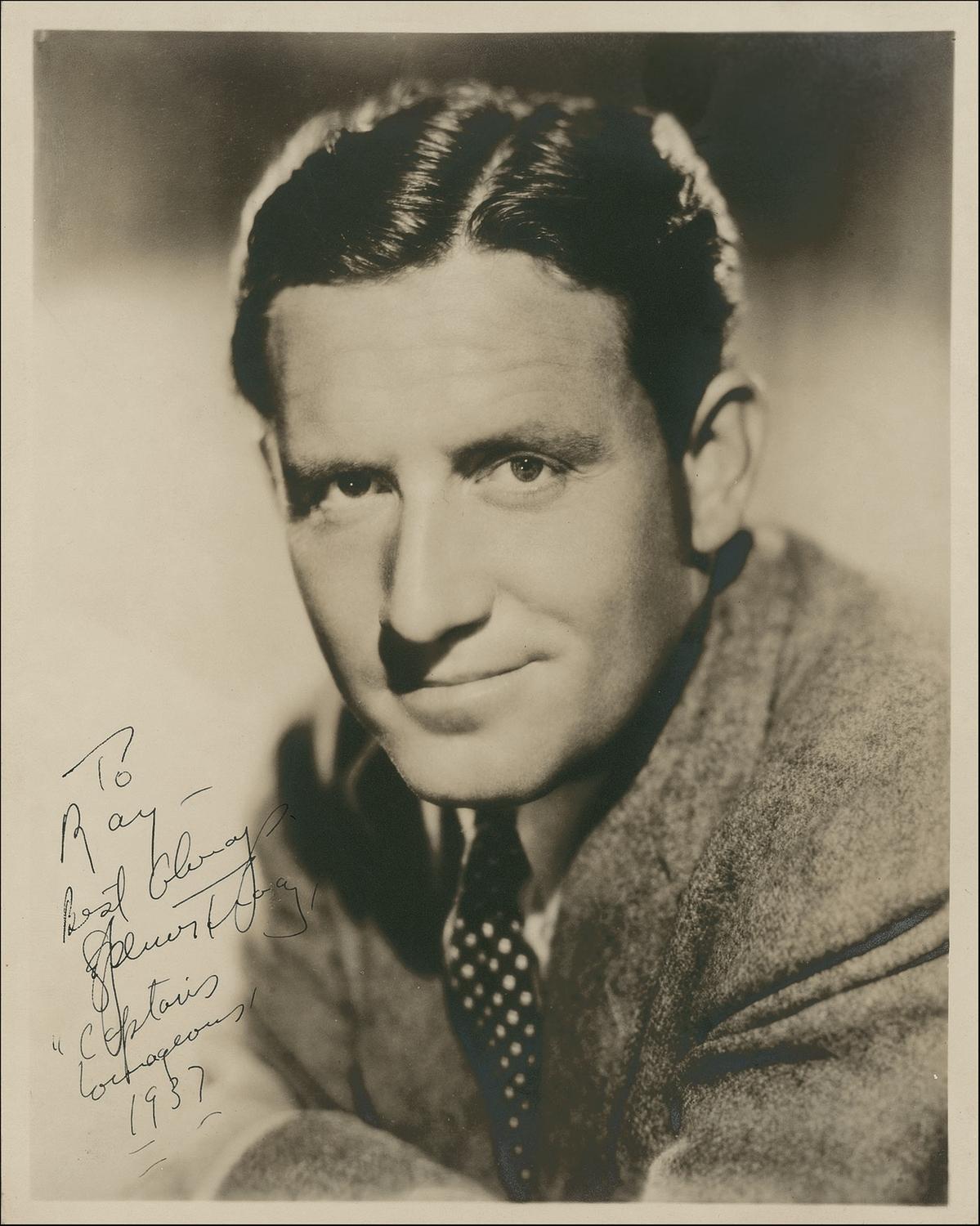 Vintage sepia matte-finish 8 x 10 portrait, signed and inscribed in black ink “To Ray-Best always, Spencer Tracy, ‘Captain’s Courageous’ 1937.” Consignor notes that the photo originally comes from the Ray Sperry estate. Sperry was Freddie Bartholomew’s stand-in double for Captain’s Courageous. Some silvering to darker areas of image and background, and a couple light spots to top edge, otherwise fine condition. Great association from Tracy’s first Academy Award winning performance.