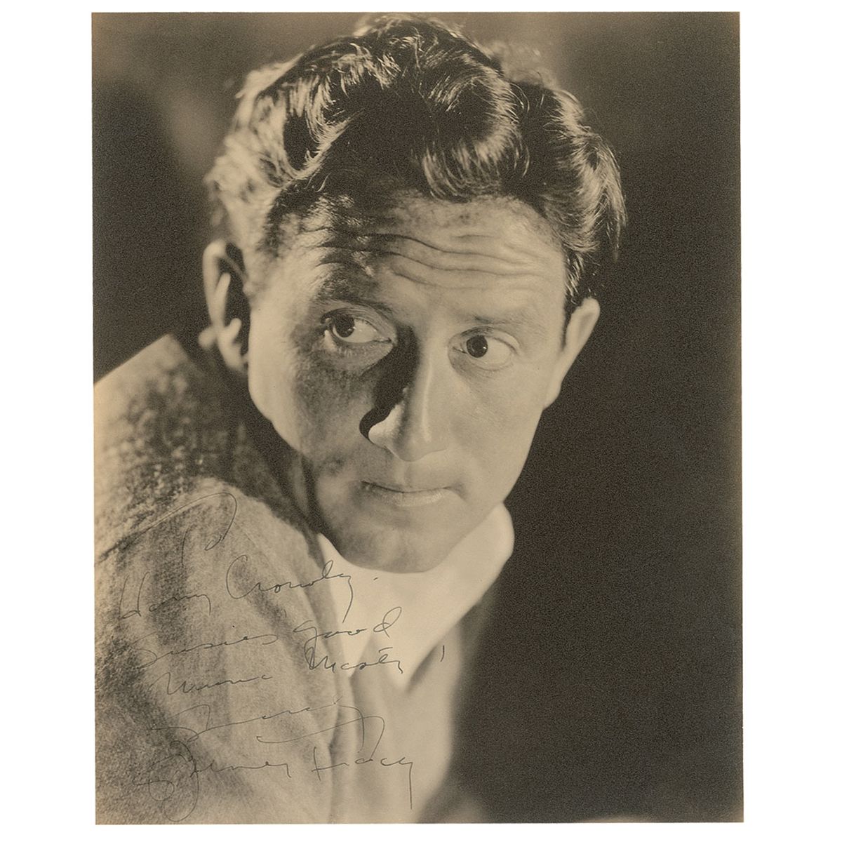 Striking vintage matte-finish 7.25 x 9 head-and-shoulders photo, signed and inscribed in fountain pen “To Harry Crowly,” adding a sentiment, and “Sincerely, Spencer Tracy.” Some light silvering to the darker areas of the image, trimmed edges, and light contrast to the inscription and signature, otherwise fine condition.