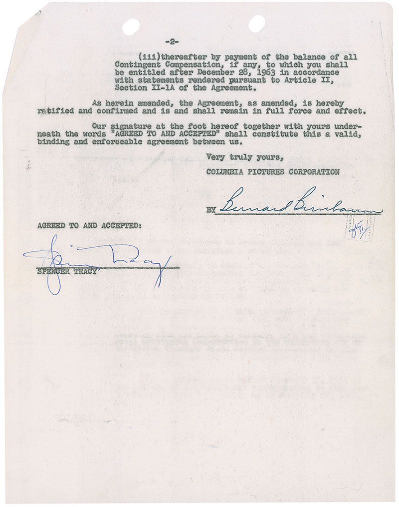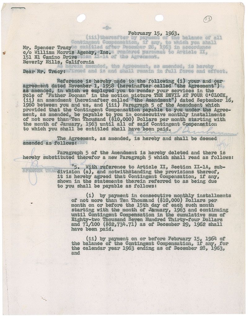 DS, two onionskin pages, 8.5 x 11, February 15, 1963. Amendment to an earlier agreement between Tracy and Columbia Pictures concerning Tracy’s role and payment for The Devil at Four O’Clock. In part: “reference is hereby made to the following…in which we employed you to render your services in the role of ‘Father Doonan’ in the motion picture The Devil at Four O’Clock…Paragraph 5 of the Amendment is hereby deleted and there is hereby substituted…a new paragrah…by payment in consecutive monthly installments of not more than Ten Thousand ($10000) Dollars per month…and continuing until Contingent Compensation in the cumulative sum of Eighty-two Thousand Seven Hundred Thirty-four Dollars…shall have been paid.” Signed on the second page by Tracy. Punch holes and a staple to top edge and scattered wrinkling and creasing, otherwise fine condition.