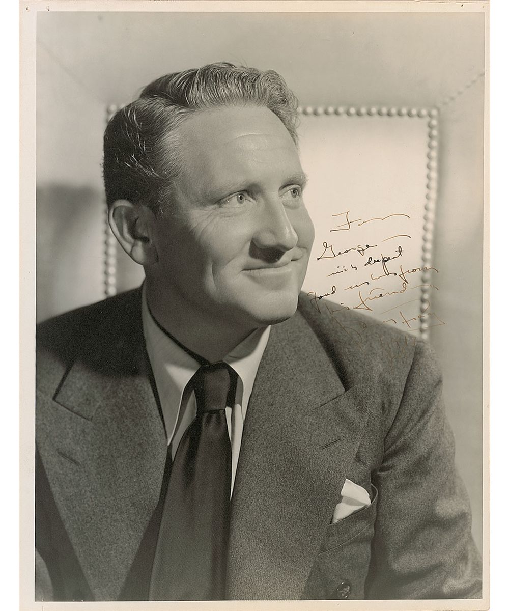 Fabulous and crystal-clear vintage matte-finish 10 x 13 photo of Tracy glancing off to the side and grinning from ear to ear, signed and inscribed to assistant director George Rhein in fountain pen “For George, with deepest good wishes from his friend—Spencer Tracy, 1947.” In fine condition, with a couple of staple holes to upper border, small creases to upper and lower right corners, poor signature contrast to his first name, and tape remnants from scrapbook removal on the reverse.
