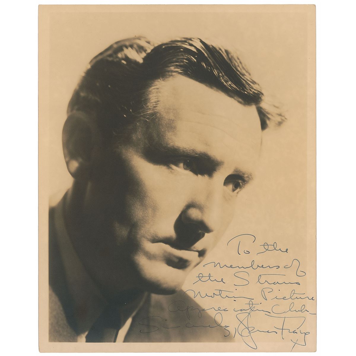 Vintage sepia matte-finish 8 x 10 close–up photo of Tracy, signed and inscribed in fountain pen, “To the members of the Straus Motion Picture Appreciation Club, Sincerely, Spencer Tracy.” In fine condition, with trivial creasing at corners.