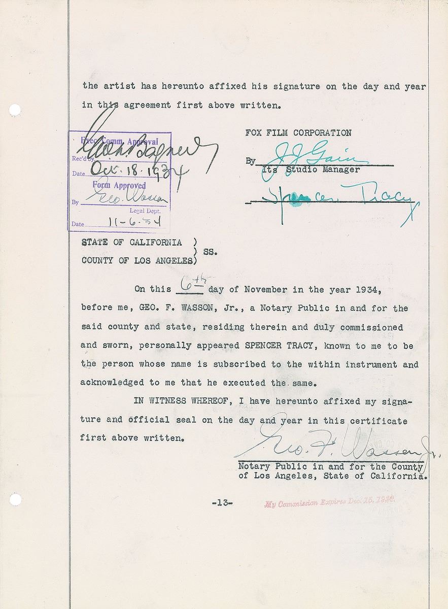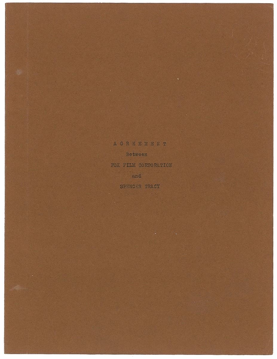 DS, thirteen pages, 8.5 x 11, November 6, 1934. Agreement between Fox Film Corporation and Tracy in which “the artist enters the employ of the producer to render services exclusively…for a term of two (2) years.” Signed at the conclusion in green fountain pen by Tracy and countersigned by a studio manager. In fine condition, with a blot to the signature. Accompanied by the original brown paper folder and a modern reprint photo.