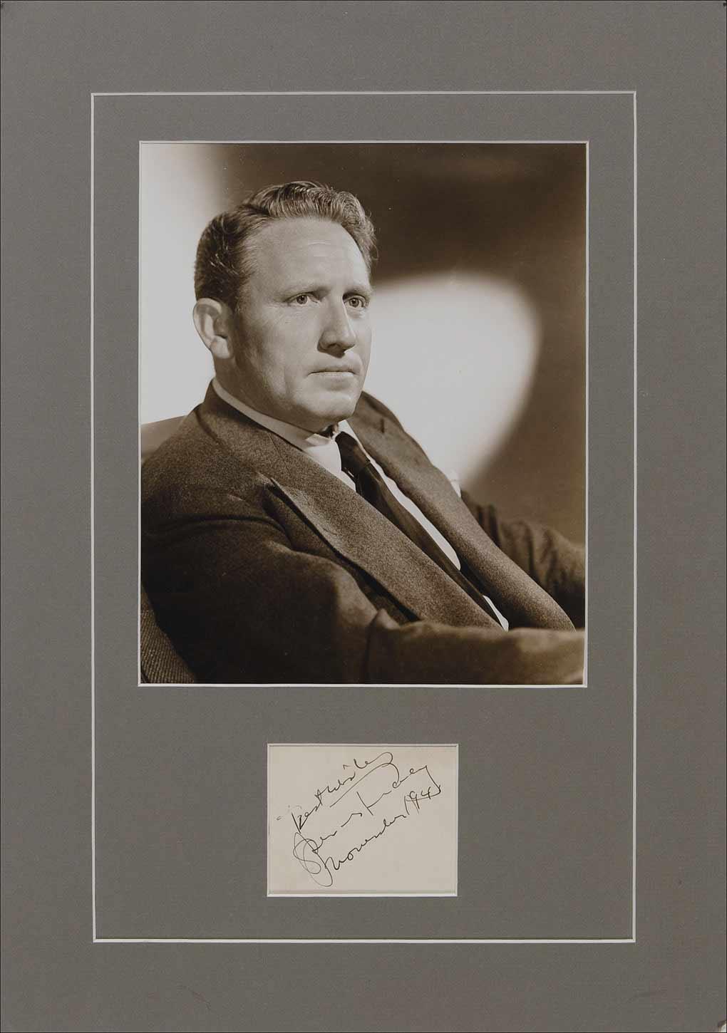 Vintage fountain pen signature, “Best wishes, Spencer Tracy, November 1941,” on an off-white album page. Matted with a glossy portrait of Tracy, to an overall size of 12 x 17. In fine condition, with a bit of scattered light soiling.