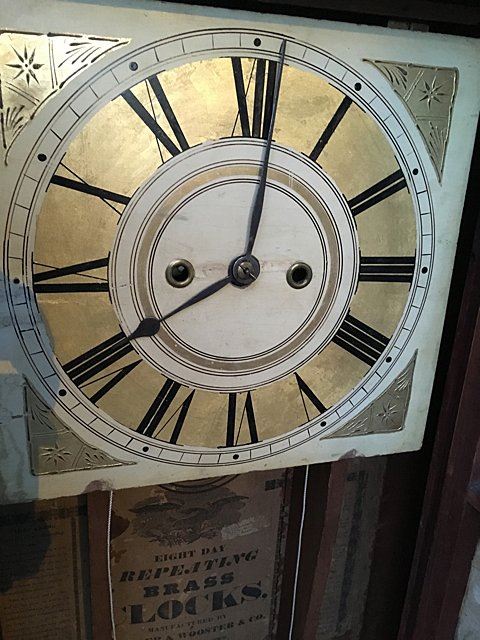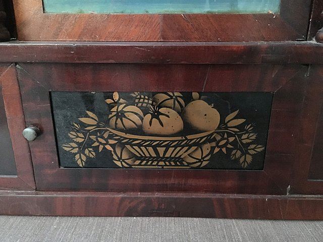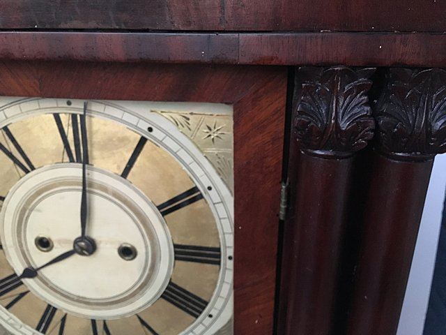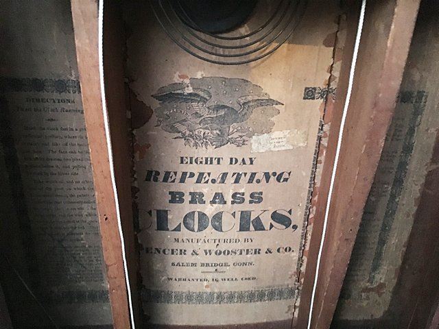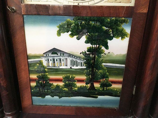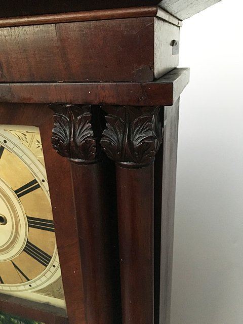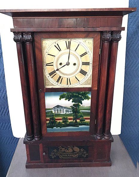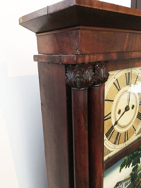 Spencer & Wooster & Co., Salem Bridge, Conn. Mahogany shelf clock, c. 1840. the cornice is supported by exceptional turned Corinthian double carved columns, painted wood Roman numeral dial, door tablet with reverse-painted scene of a country house, label inside marked in part Eight Day Repeating Brass Clocks, Manufactured by Spencer & Wooster & Co., brass, eight-day, time and rack strike movement powered by two compounded cast iron weights. Beautiful lower glass with gold gilt fruit bowl, nice label. Measures approx. 34" tall x 18" wide x 5 1/2" deep.