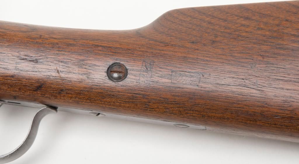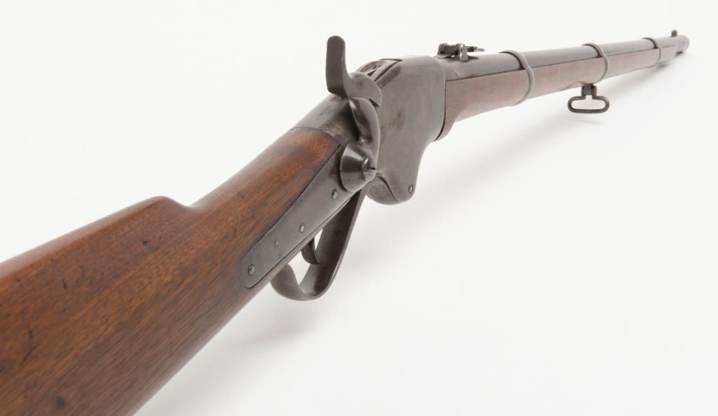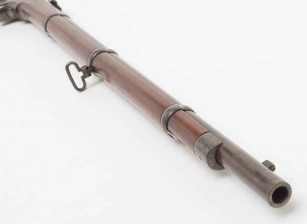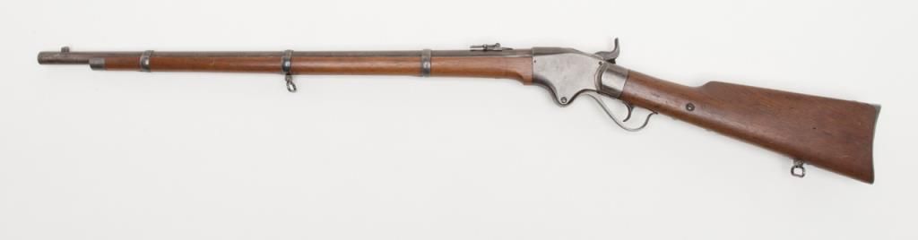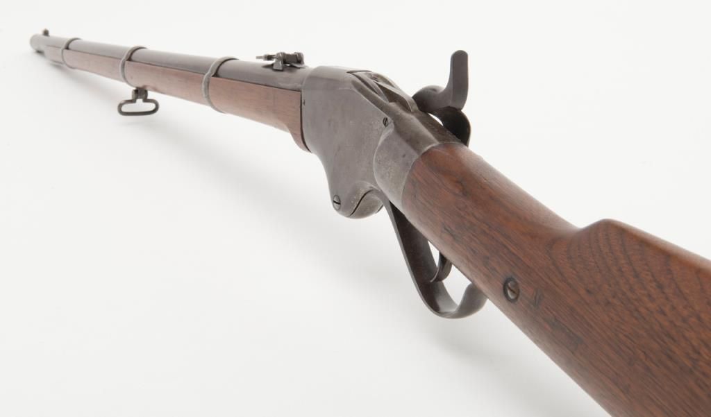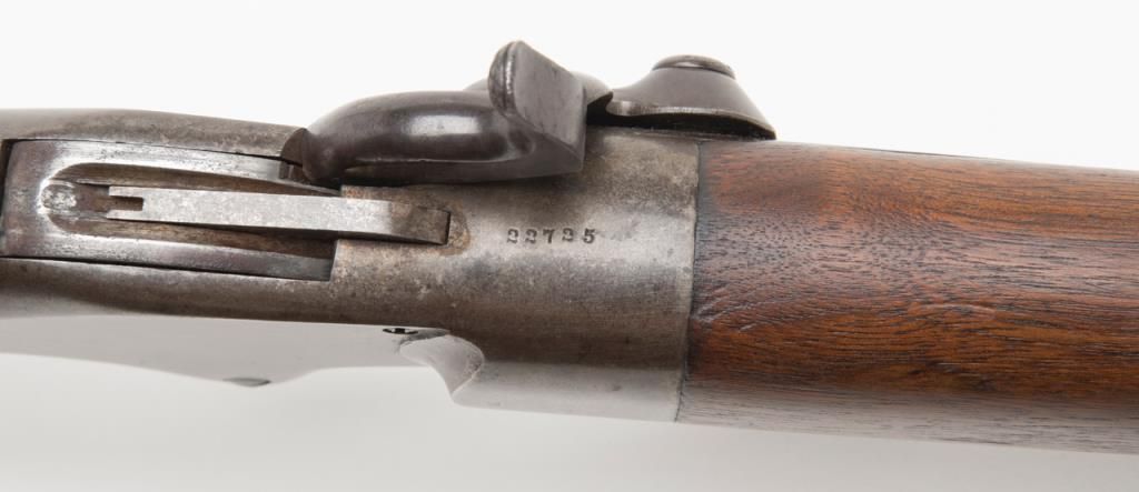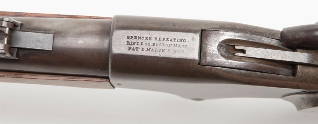 Spencer military style rifled musket, .52 caliber, 30” barrel secured by three bands in good to very good condition, serial number 22725. The metal surfaces show a gray to brown patina finish with traces of original case hardening mixed in andgood smooth metal surfaces. The address on the top of the frame is well stamped and mostly visible. The stock is good to very good with two cartouches on the left side. The action is good and the bore is fair with some areas of roughness. Est.:$2000-$4000