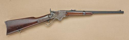 Spencer model 1865, lever action repeating carbine, .52-56 caliber rimfire, blue and case hardened finish, cartouche wood stocks, serial #62253. The carbine shows M.S. markings at right side of frame, 1.C. marking at center of frame, and 1.C. marking at top of frame. Also there is an M.S. stamp between the two inspector’s cartouches just behind the saddle ring bar. The left side of the breech shows an “E.A.W.” inspection and the fame shows small “M”, “R”, “W” and other martia marks. There is also an M.S. stamp directly behind the triggerguard. The carbine remains in original very good condition with 85-95% toning arsenal blue finish on barrel, the frame shows traces of case hardening within a grey patina with some noticeable case hardening on hammer and lock plate. The buttplate shows traces of case hardening. The stocks are good to very good with a couple of compressions, minor dings, mars, scratches, consistent with military use and issue. One large sliver of wood or chip missing just behind the hammer, extending back approx. 1-1/4” by 1/4 at widest point. The stock also shows an “E.A.W.” inspector stamp by buttplate and an M.S. on the forend just in front of the three MS stamps"