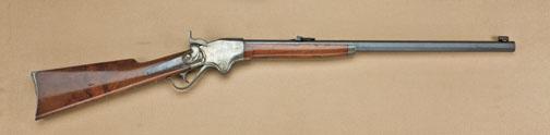 Spencer sporting rifle with factory heavy octagon barrel, .46 rimfire caliber, blue and case hardened finish, select varnish burl walnut stocks, serial #38237. The rifle shows factory 26” octagon barrel of slightly heavy weight which measures approx. 15/16” across the barrel flats. The rifle shows a matching serial number on the barrel. The forend is secured by two screws and has a pewter forend cap. The barrel shows approx 75-85% original blue that is evenly toning and drifting to patina, some scattered light to moderate erosion and some minor pinprick pitting just starting along with normal aging. The rifle retains its original ladder type rear sight, which is factory mounted further down the barrel than normal at the original ordered request and shows a hooded type front sight. The action shows flattening to marry the octagon barrel by the factory and the frame, lock, and lever show 20-30% case hardening within a graying patina with some feint colors. The wood stocks are good to very good with 75-85% varnish, a few mars and scratches and a crack behind the frame at the top of the wrist where the wood has been secured with a rude wood screw and shows a small loss. This is an old
