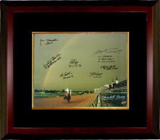 The Kentucky Derby is a Grade I stakes race for three-year-old Thoroughbreds, held annually in Louisville, Kentucky, on the first Saturday in May, capping the two-week-long Kentucky Derby Festival. The race is one and a quarter miles at Churchill Downs. The race is known in the United States as "The Most Exciting Two Minutes In Sports" or "The Fastest Two Minutes in Sports" for its approximate duration, and is also called "The Run for the Roses" for the blanket of roses draped over the winner. It is the first leg of the US Triple Crown The Kentucky Derby has been run every consecutive year since 1875. This Churchill Downs Kentucky Derby Rainbow 16x20 Photo has been signed by 9 Past Winners (7 Jockeys) each with the Date Won and the horse they rode. Jean Cruguet - Slew 77; Ron Franklin - 79 Spectacular Bid; Steve Cauthen - Affirmed 78; Pat Day - 92 Lil E Tee; Angel Cordero - 74 Cannonade, 76-Bold Forbes, 85 - Spend The Buck; Laffit Pincay - Swale 1984 and Stewart Elliott - 04 Smarty Jones. MAB Hologram and Certificate of Authenticity from Athlon Sports. Custom Black Mat and Premium Mahogany Color Framed as shown.