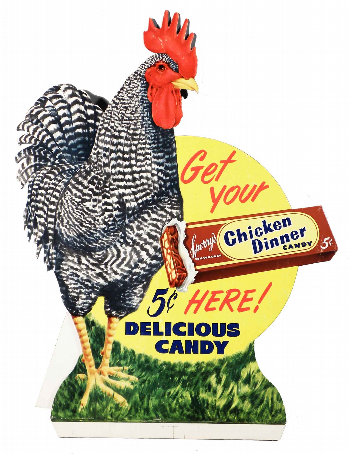 Sperry's Chicken Dinner Candy Die Cut Cardboard Easel Back Sign. Very minor rubs otherwise excellent condition. 18 X 23 1/2 inches.