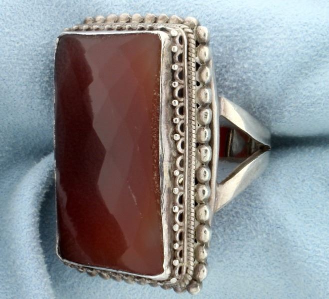 This .925 sterling silver ring contains a large 1 1/4 x 7/8 inch spessarite garnet gemstone and is a size 8 1/2. 28.8g