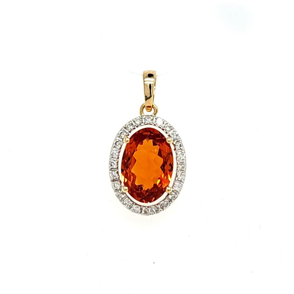 Genuine Garnet and Earth-Mined Diamond Pendant.& nbsp; This is a 14 karat yellow gold pendant that features a warm and glowing orange 4.22 carat oval-cut Spessartine garnet that is prong-set with .24 carats of round, brilliant-cut, H-I color, I1 clarity diamonds in the halo.& nbsp; The pendant is approximately 3/4& quot; long and 1/2& quot; wide and has a solid bail connected to an affixed jump ring.& nbsp; This pendant is certified and appraised for $14,710.00 estimated retail replacement value.& nbsp; CHECK OUT THE MATCHING RING IN LOT 90!!