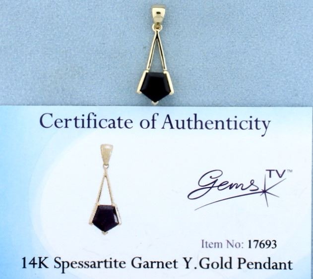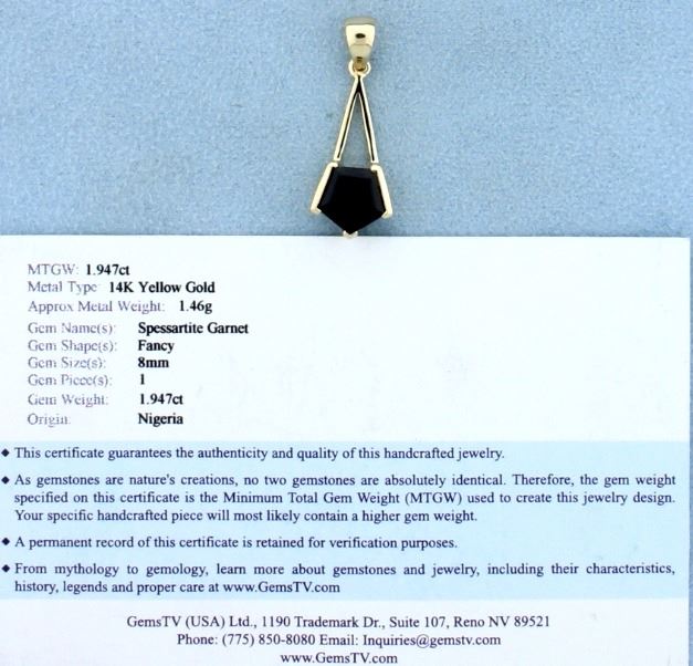 Fantastic and unique 14k yellow gold pendant with a beautiful 1.947 carat Fancy Spessartite Garnet gemstone. This piece was originally purchased from Gems TV and comes with Certificate of Authenticity. NO CHAIN 2.0g